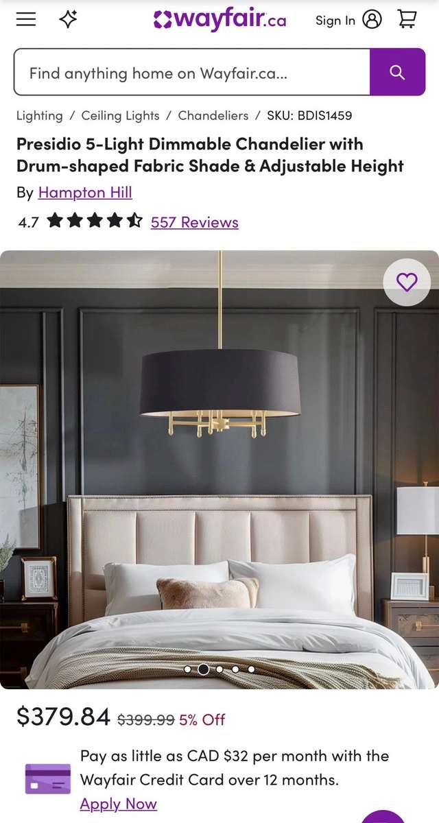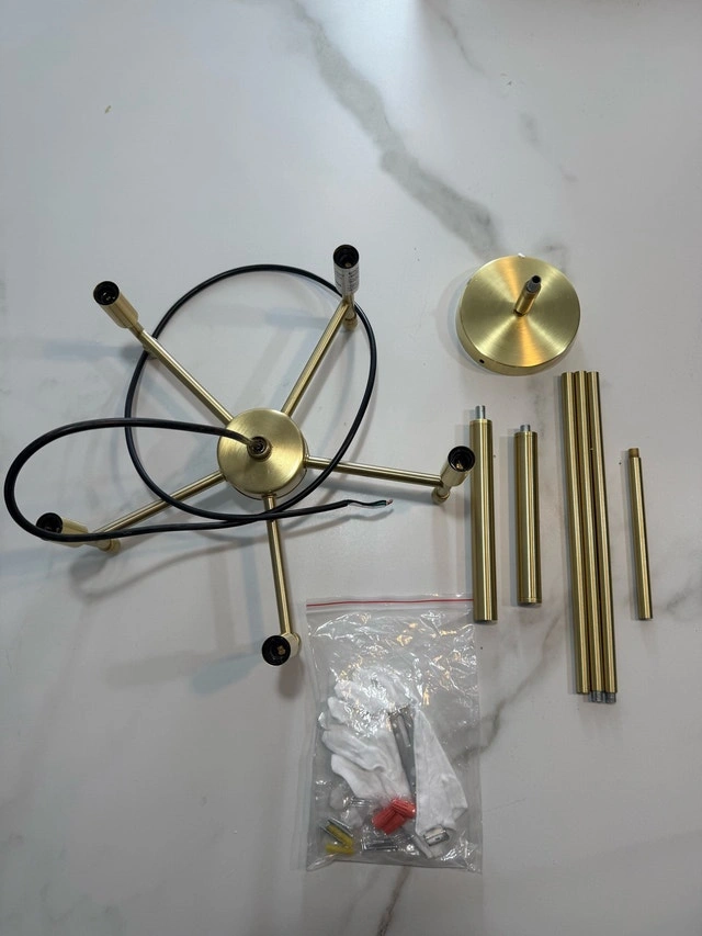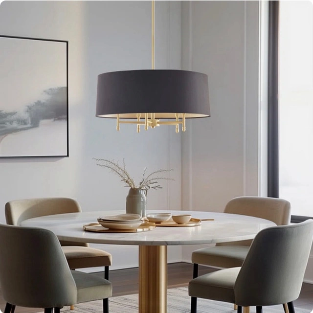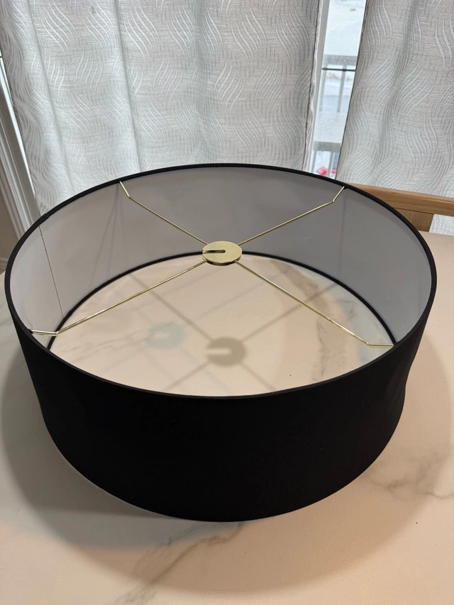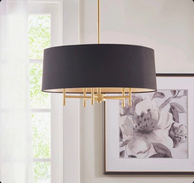 Elegant 5-light chandelier with a modern gold metal frame and a black tapered drum fabric shade for soft ambient lighting. Provides both upward and downward light. Dimmable with a compatible dimmer switch and E12 bulbs (not included). Adjustable hanging height includes 3x12” rods + 1x6” rod. Compatible with flat, sloped, and vaulted ceilings. Open bottom design for easy bulb replacement. Bulb Base: E12 / Candelabra (Max 40W per bulb). Voltage: 110V. Material: Iron frame with cotton/cotton-blend shade. Finish: Gold / Black. Overall Height (Hanging): 62.5”. Fixture Size: 11.25” H × 13.75” W × 13.75” D. Shade Size: 8.25” H × 24” W × 23” D. Weight: 2.67 lb. Perfect for dining rooms, bedrooms, living rooms, or entryways with modern, transitional, or classic décor. Note: If you look carefully at the photos, the inner part seems to have a slight dent, but it does not affect the overall appearance of the chandelier. I mentioned it here for more transparency.