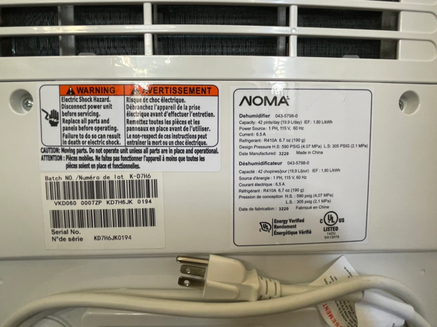 Noma 42 pints/day Dehumidifier. Model 043-5798-0. Purchased new two years ago, have used less than 10 times. I have asthma and this worked well to remove excess moisture from rooms. Did not end up needing this model as I had a smaller dehumidifier that worked fine on its own.