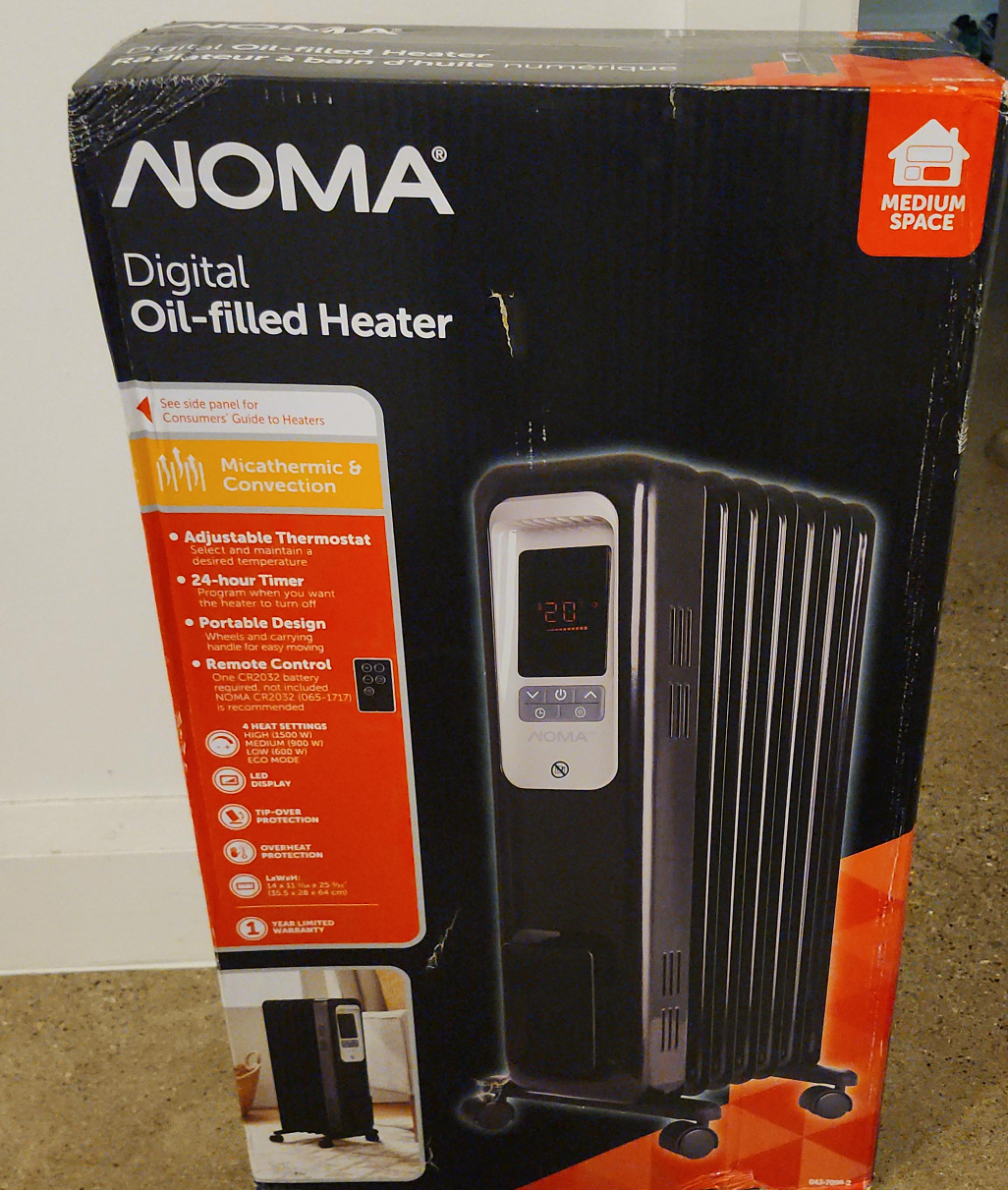 Keep your space cozy with this NOMA digital oil-filled heater! It features an adjustable thermostat, a 24-hour timer, and a remote control (battery not included). It's also designed for easy portability with wheels and a carrying handle. Perfect for medium-sized rooms!