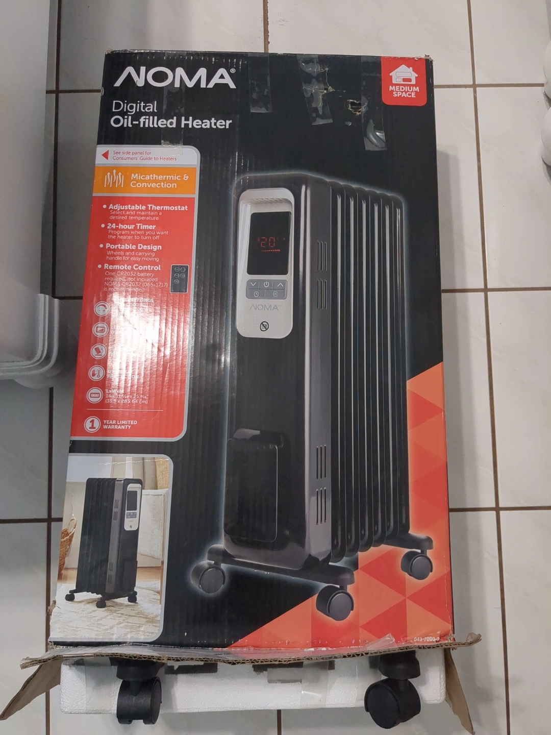 Portable oil-filled heater. Features adjustable thermostat, 24-hour timer, and remote control. MicaThermic & convection heating. Medium space heater.