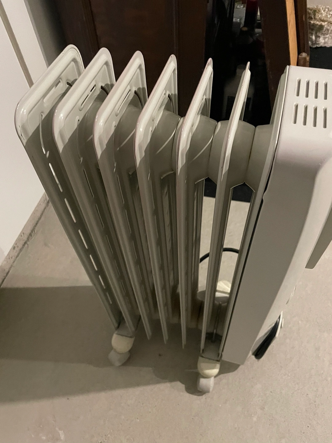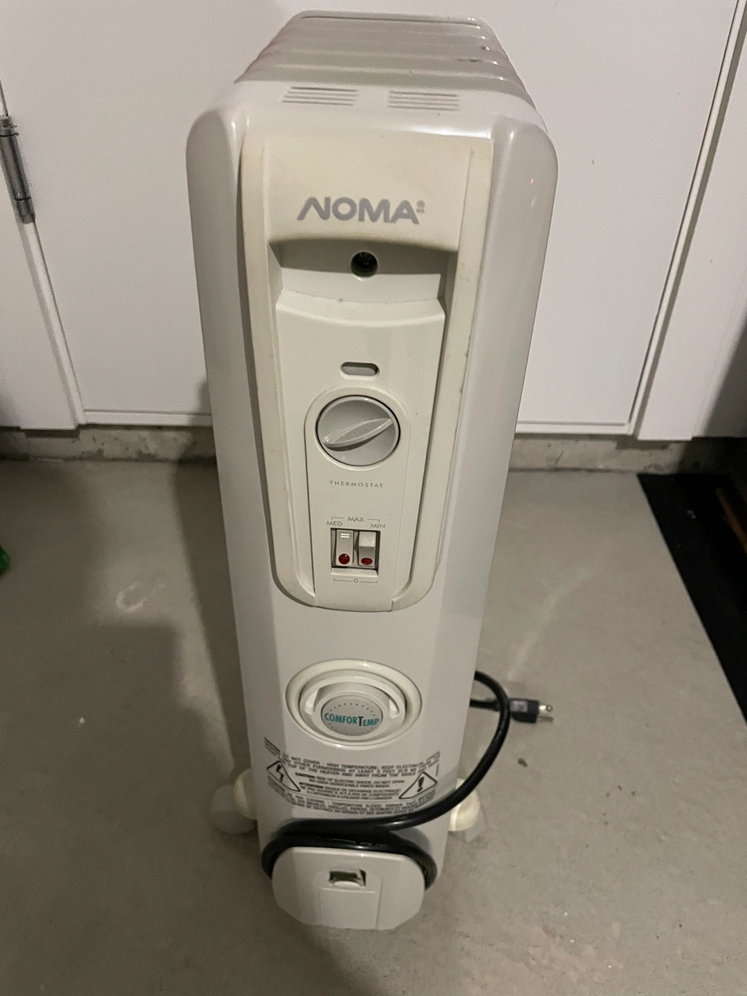 Noma oil Electric heater with multiple heat settings. It has wheels for easy mobility.