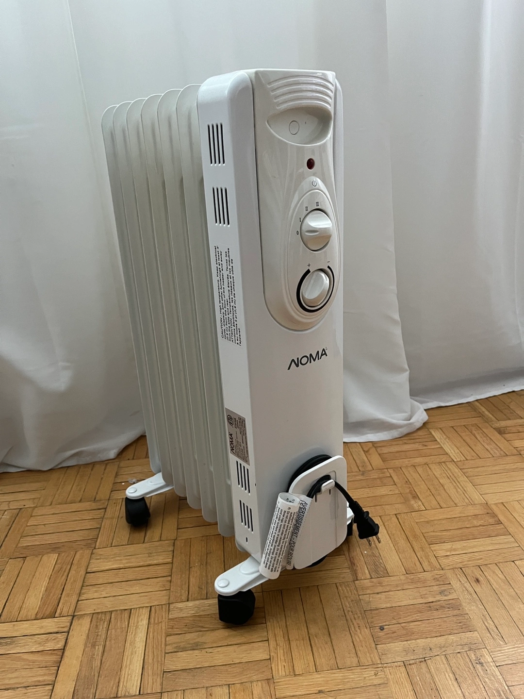 White oil-filled radiator heater. Features adjustable thermostat and power settings. Model No. 4003575.