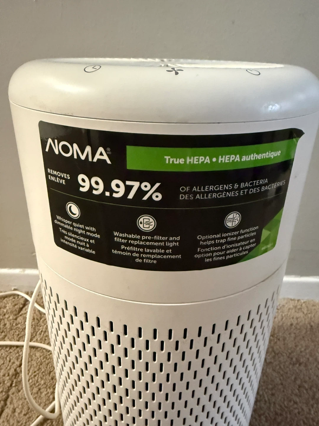 138NOMA True HEPA air purifier! It removes 99.97% of allergens and bacteria. It also has a washable pre-filter and filter replacement light, plus an optional ionizer function. It also has a whisper quiet with dimmable light mode. Pick up at Frobisher lane.