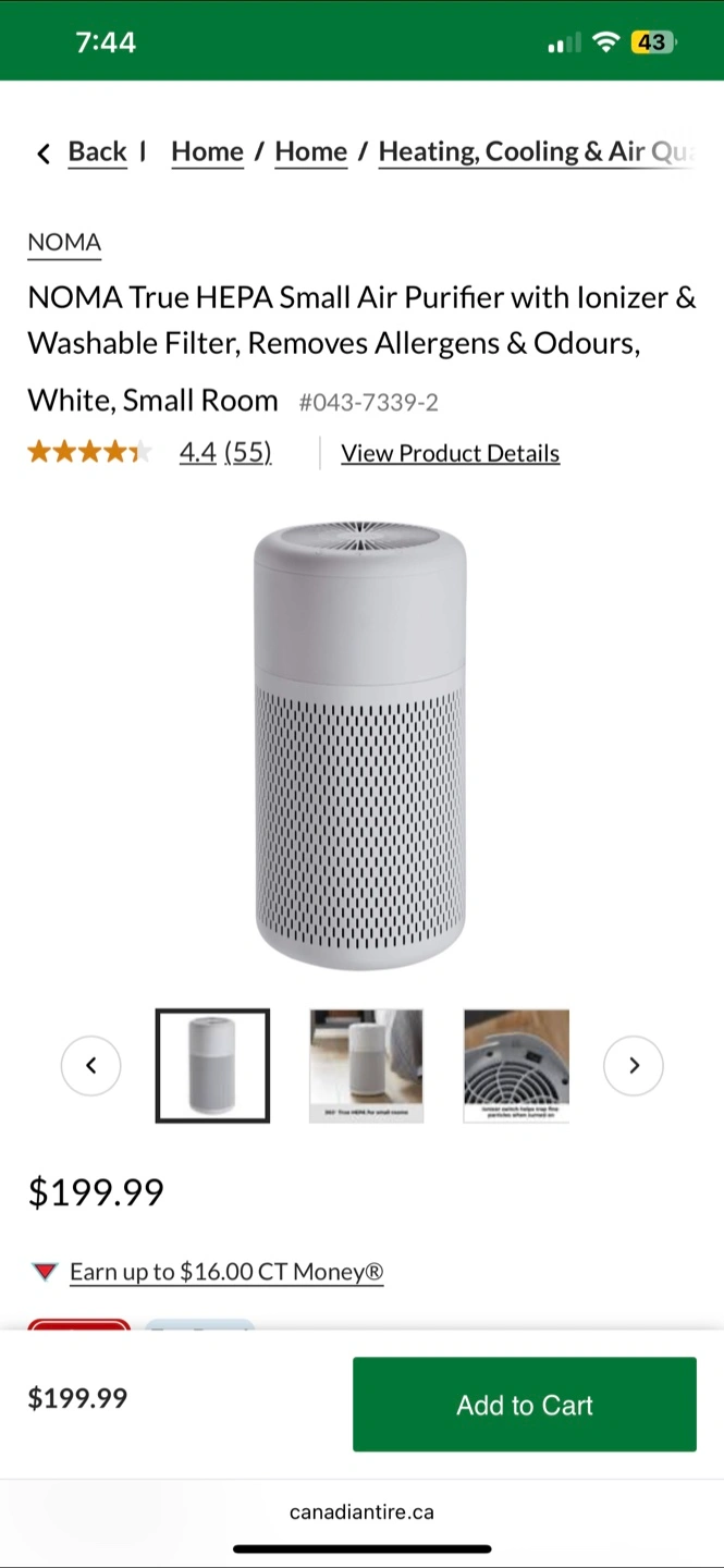 15Selling a NOMA True HEPA small air purifier in white. It comes with an ionizer and washable filter, designed to remove allergens and odours. Originally bought for $199.99.
