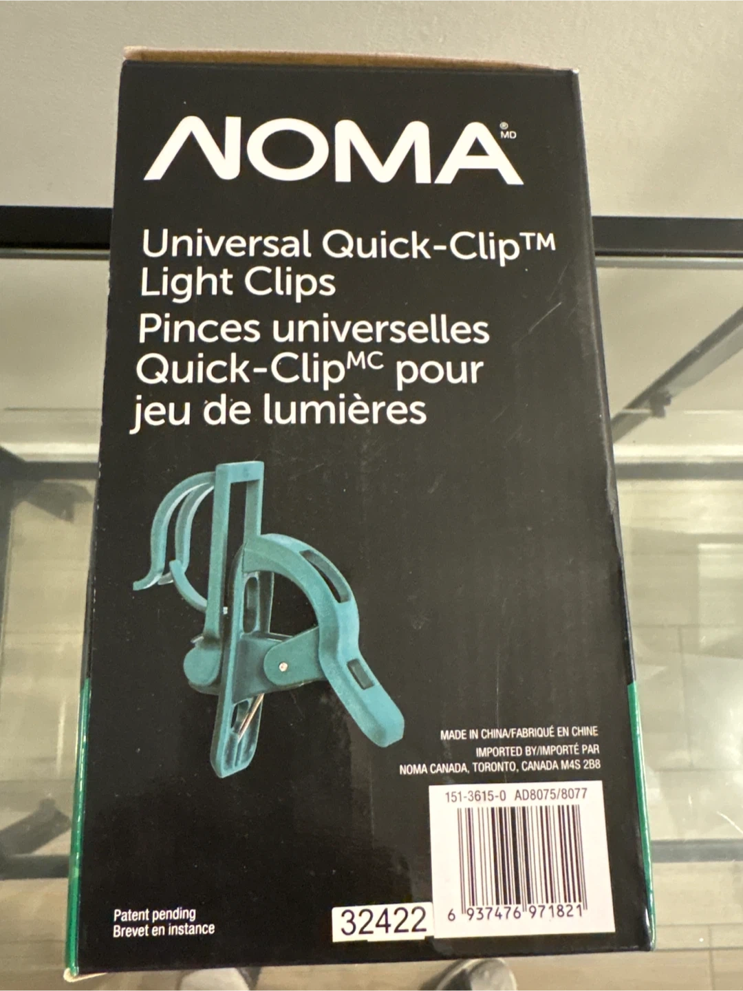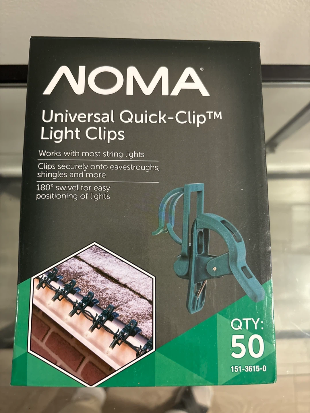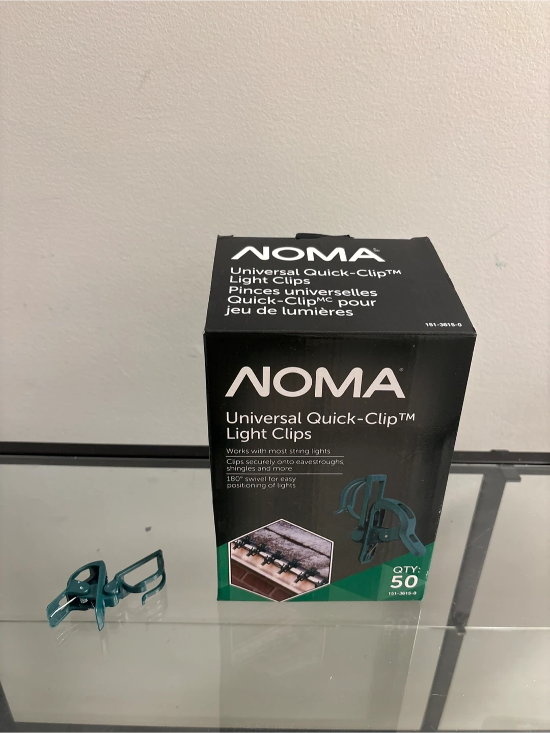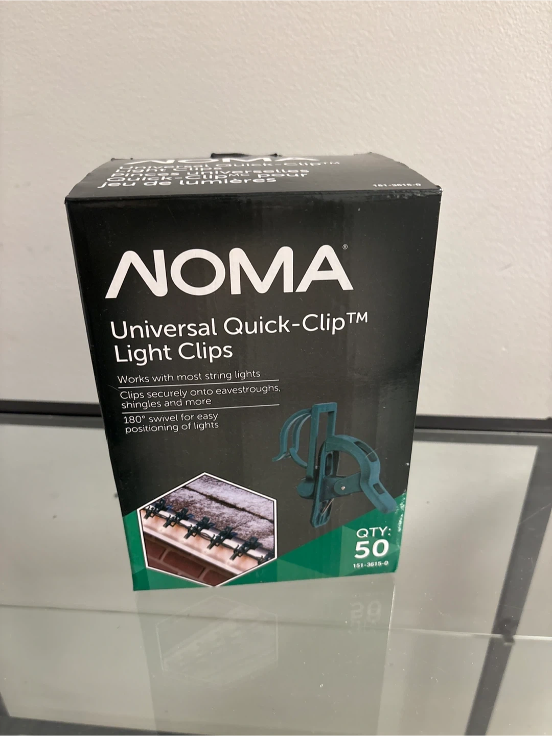 98I'm selling a pack of NOMA Universal Quick-Clip Light Clips. This pack contains 50 clips, perfect for hanging string lights securely onto eavestroughs, shingles, and more. They also feature a 180° swivel for easy positioning of lights. Get ready to light up your home!