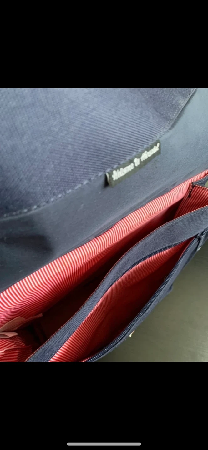 • Technical fabric backpack, featuring snap fastening, leather strap, replacement buckle, zipped pocket, white and red striped lining.