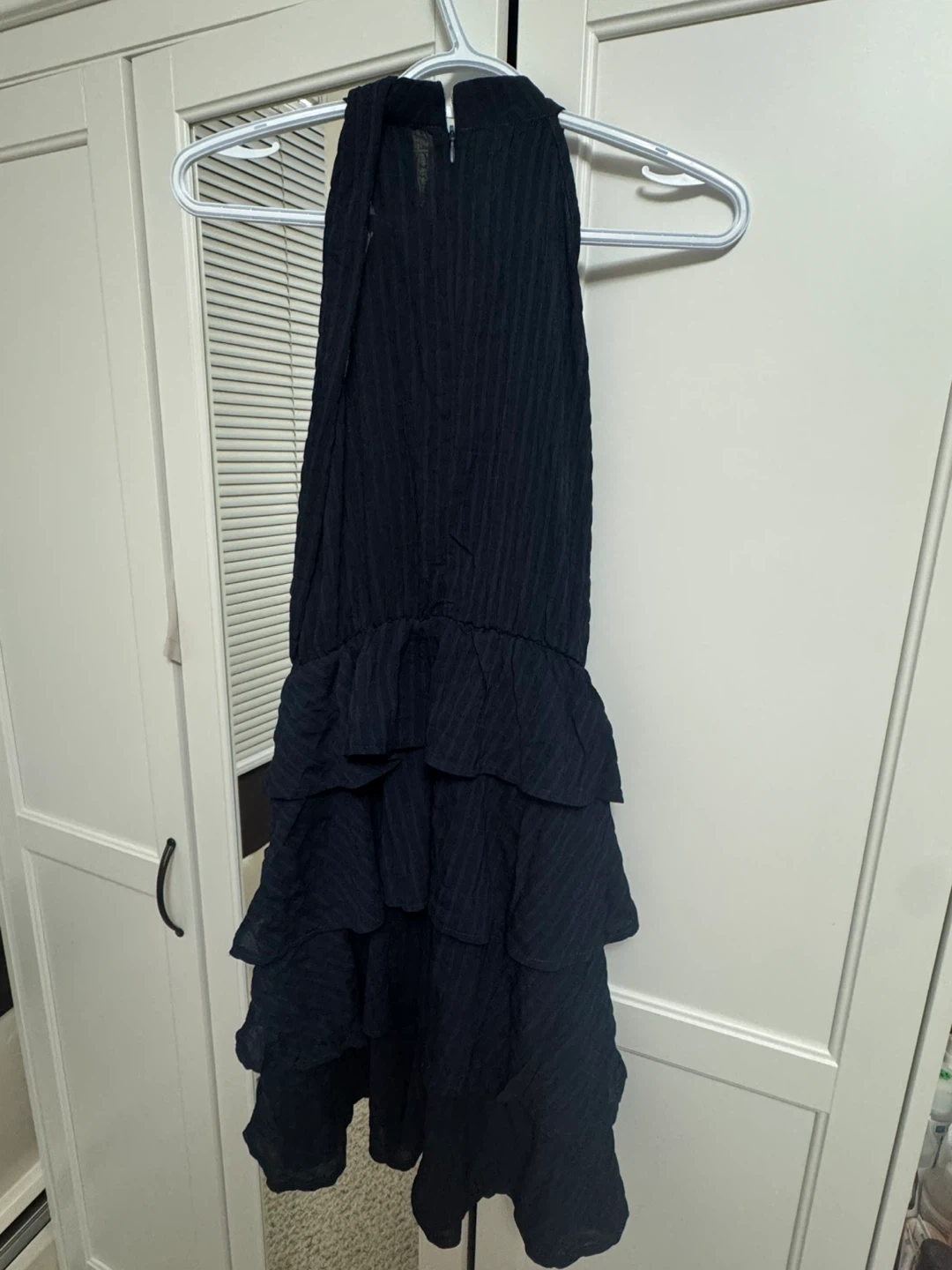 A blue halter neck mini dress with ruffled tiers. It's made from a textured fabric. This dress is perfect for a night out!