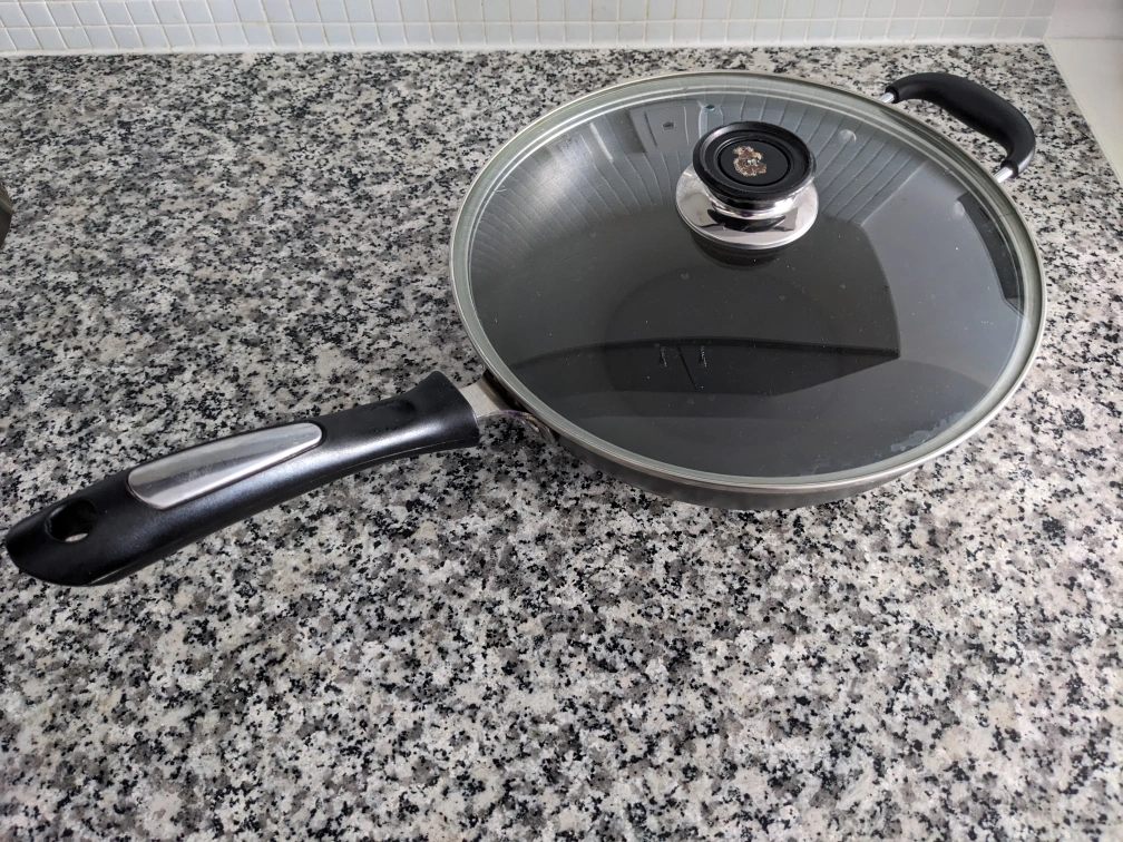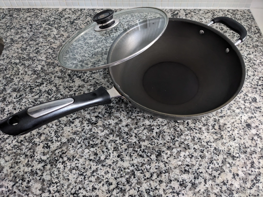 Black wok with a glass lid. About 11" diameter, 4" deep