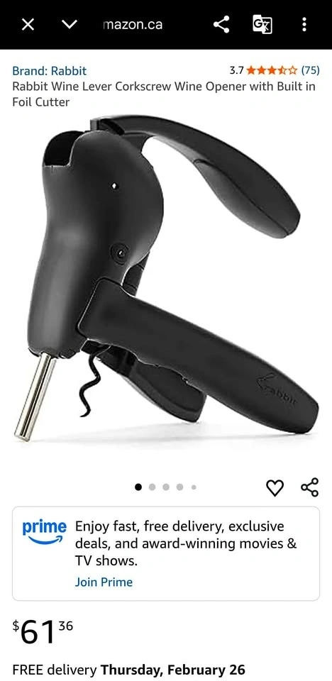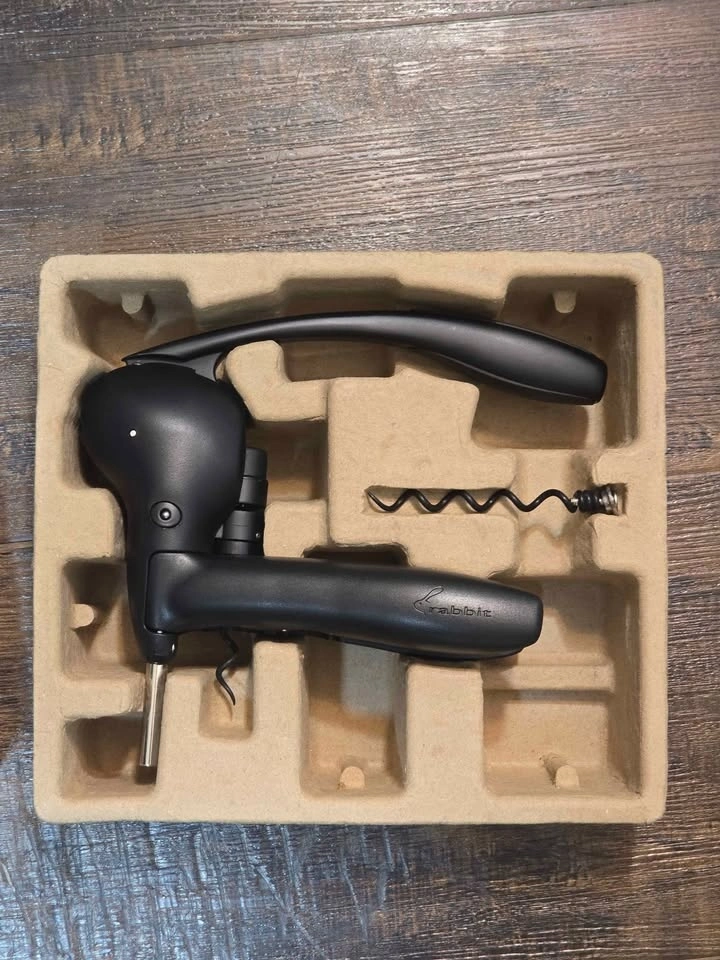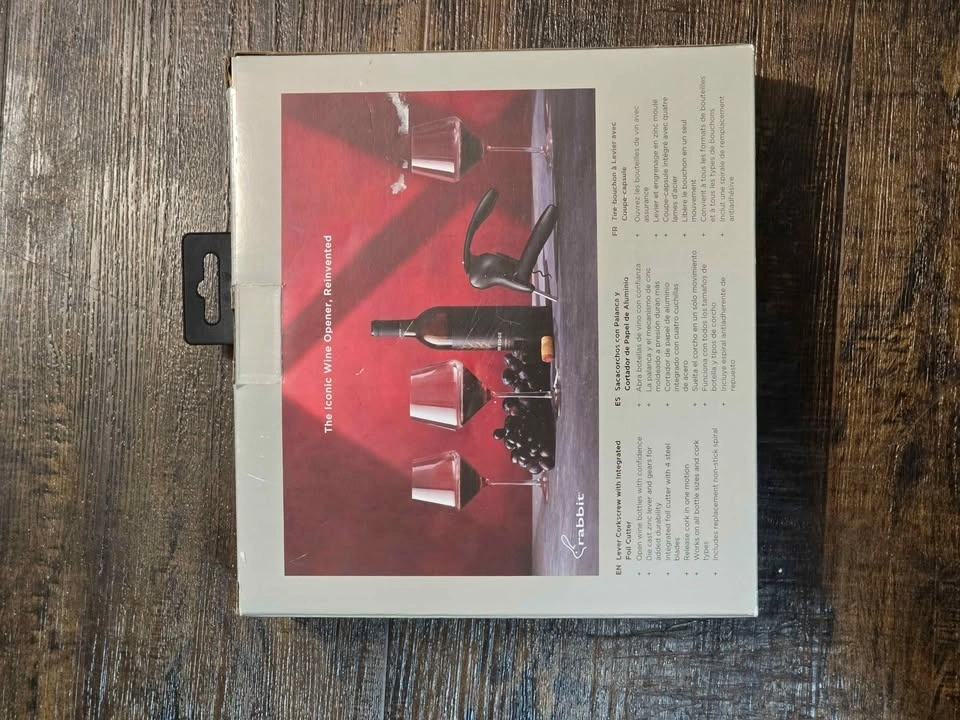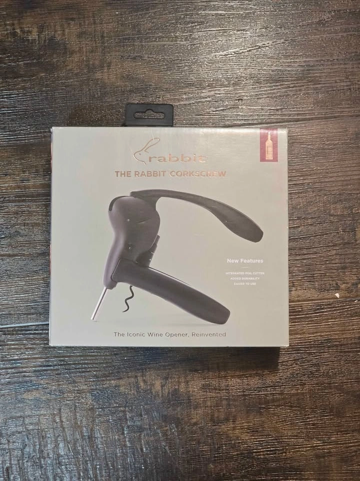 New rabbit wine opener, never used! It has a lever corkscrew and foil cutter, so you can ditch those broken corks. Solid metal lever, easy peasy to use. Measures 6.3 inches tall and 7.76 inches wide. Great for opening wine bottles hassle free! Sells on Amazon for $61.