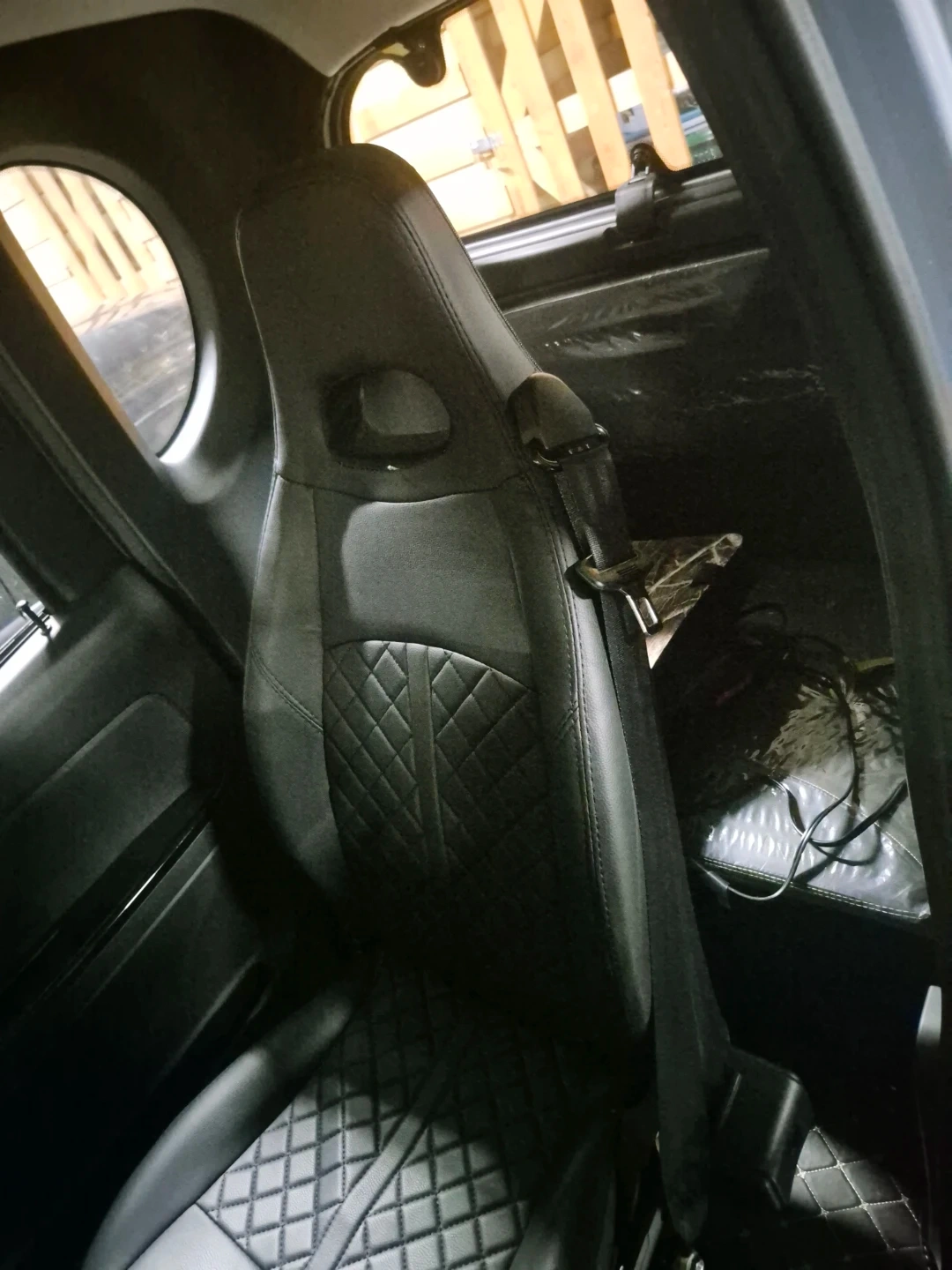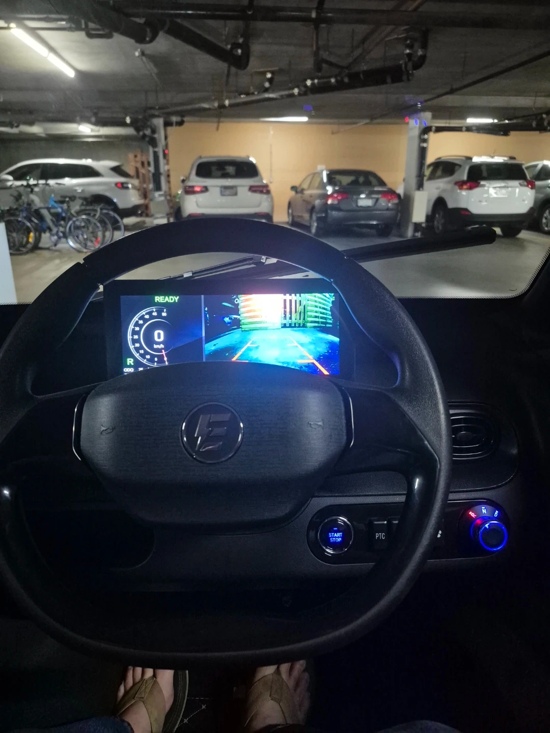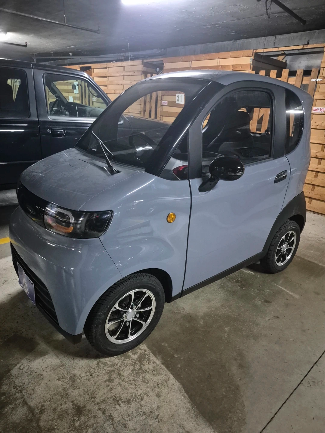 Grey EVOUQE ENZA electric car. It's a compact vehicle with a sleek design. Features quilted interior seating and custom floor mats. Great for city driving!