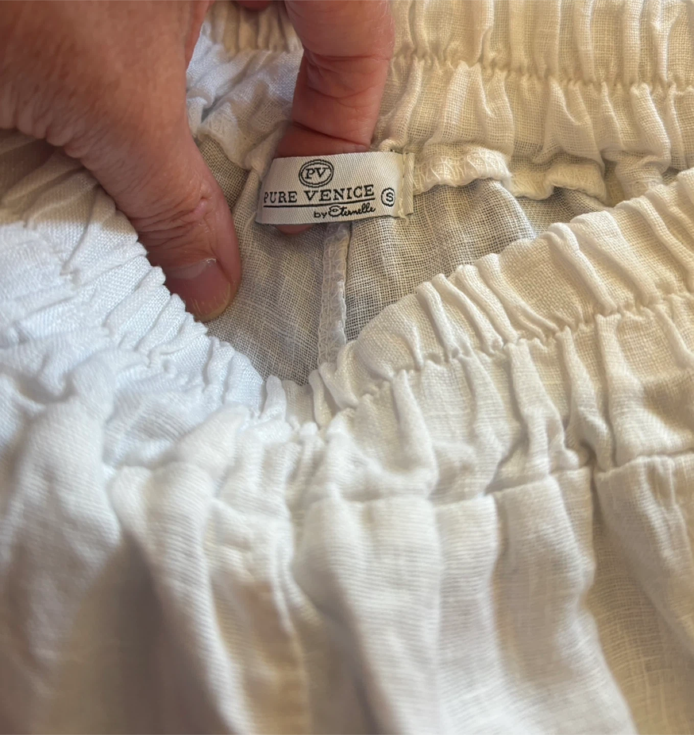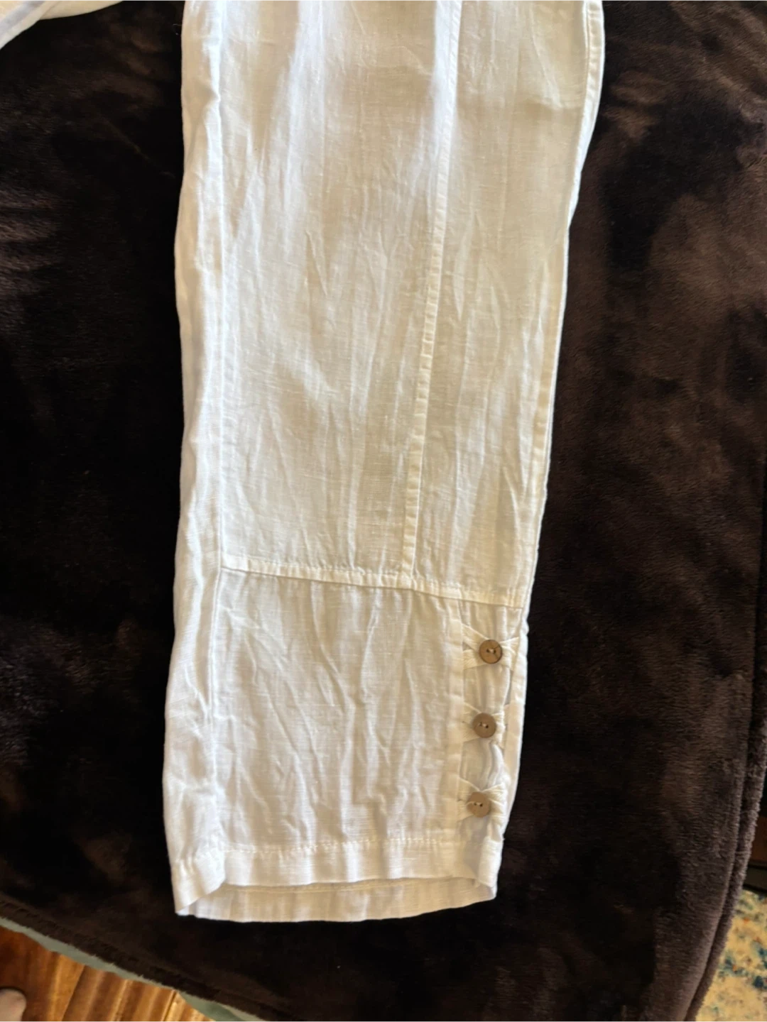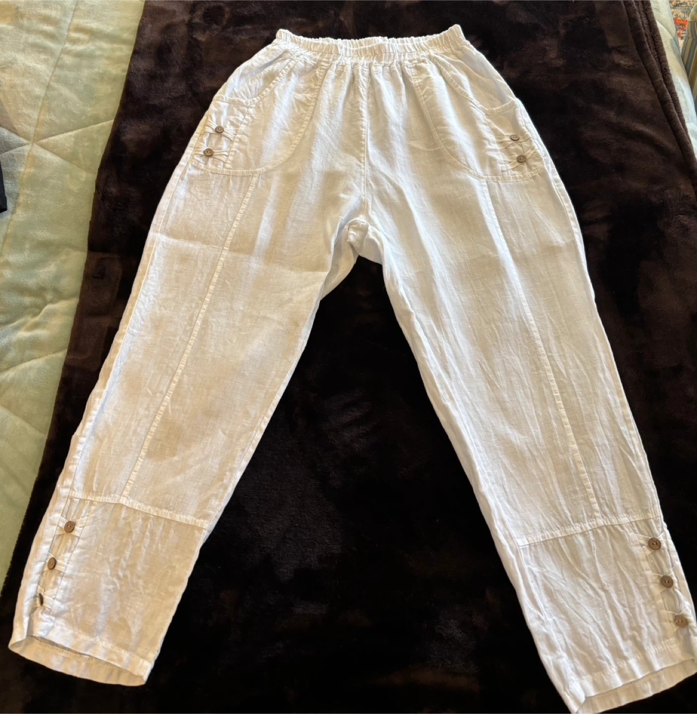 Pure Venice, made in Italy white crop linen pants, with nice button details. About 24” inseam, in the excellent condition. Size small. Machine wash in cold water.