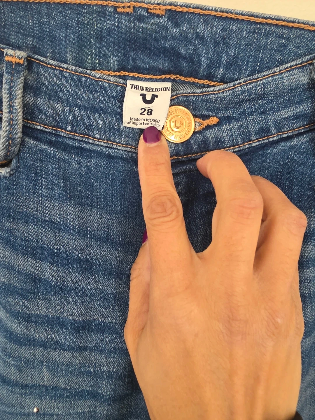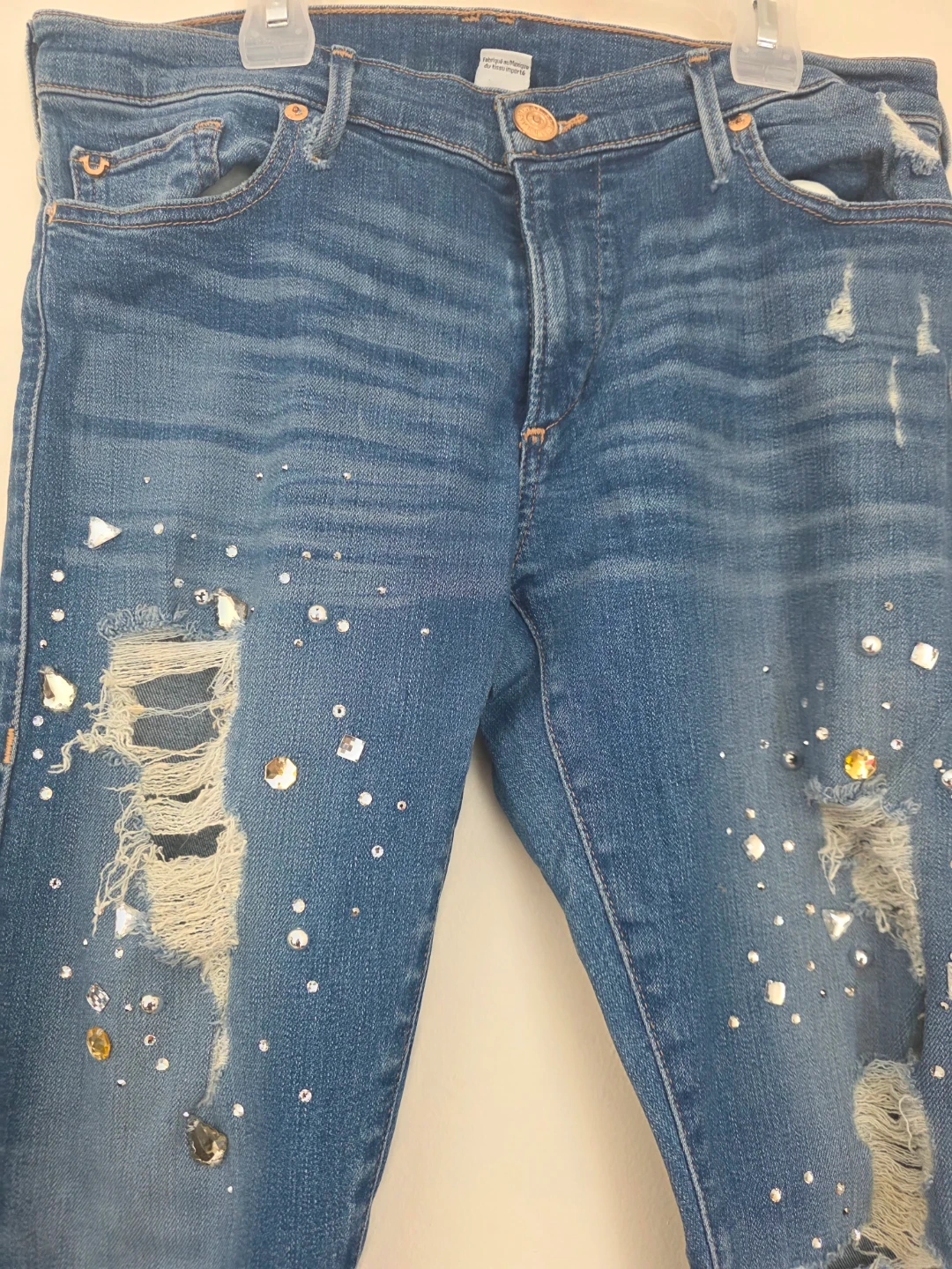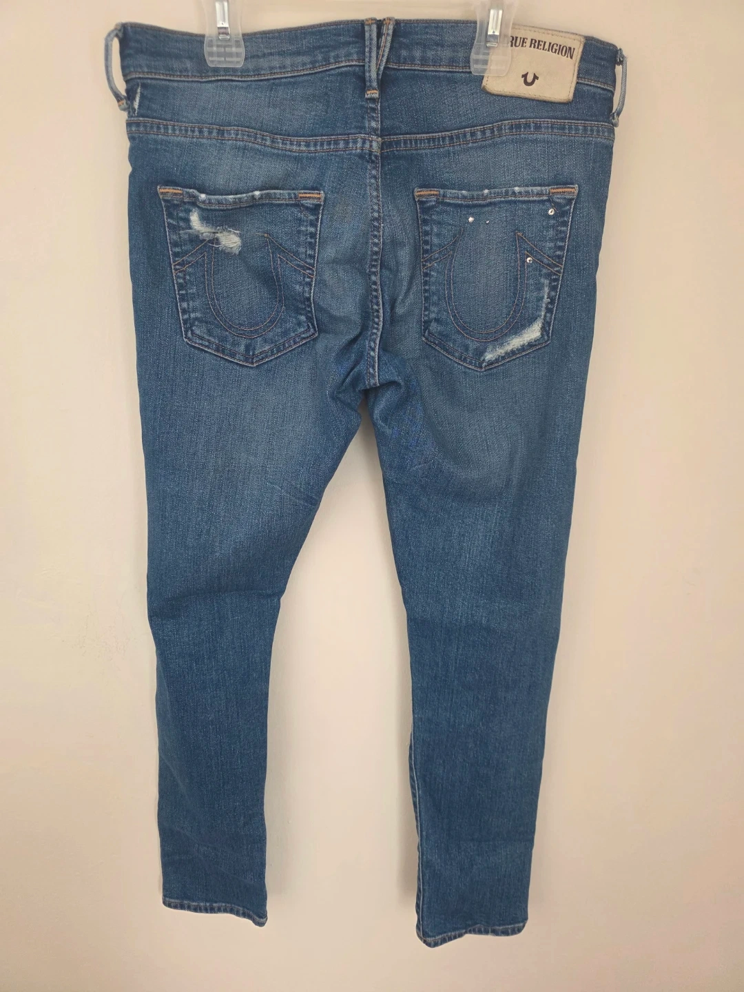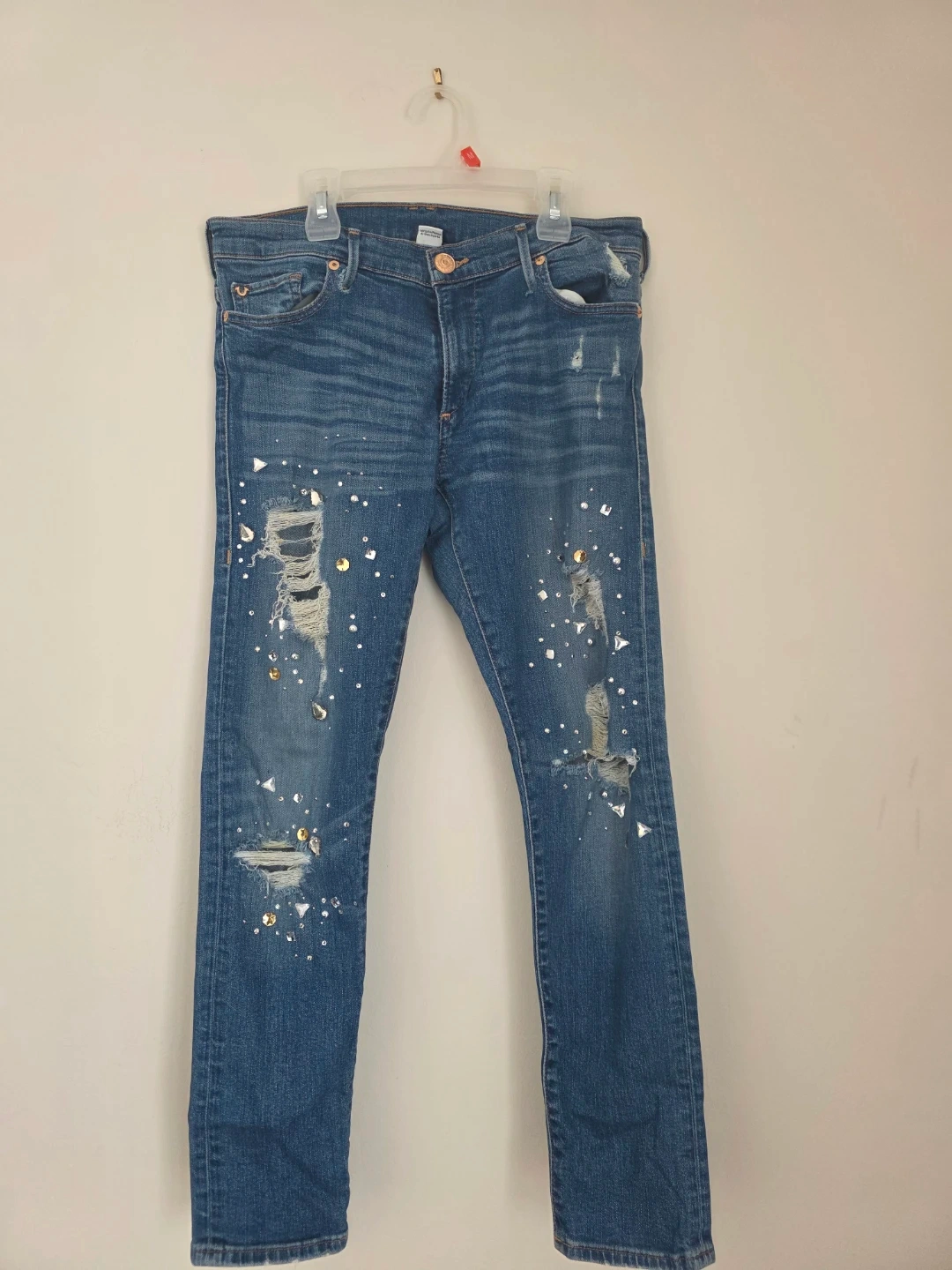 Selling a pair of True Religion jeans in size 28! They have a unique, distressed look with some decorative embellishments. Perfect for adding a bit of edge to your wardrobe