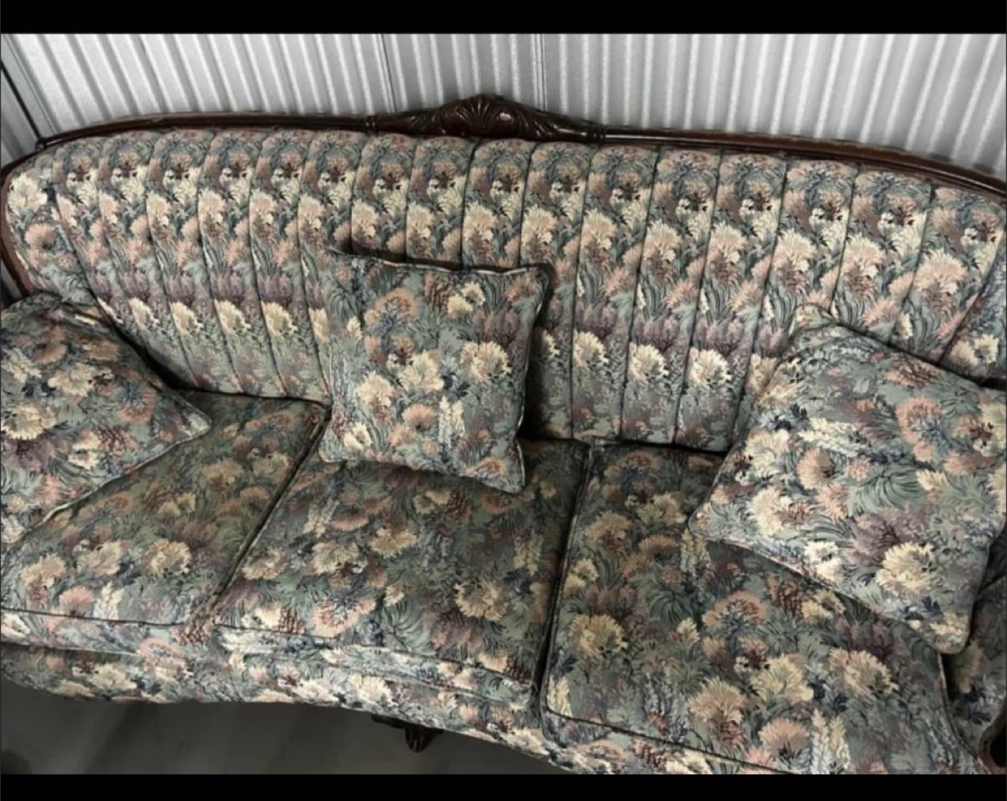 Vintage sofa with a floral upholstery pattern. It features decorative wood trim along the top and arms. Includes matching throw pillows.