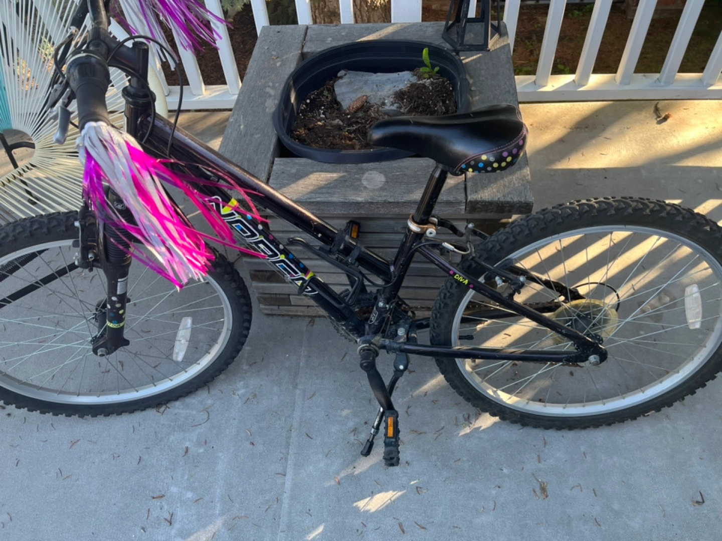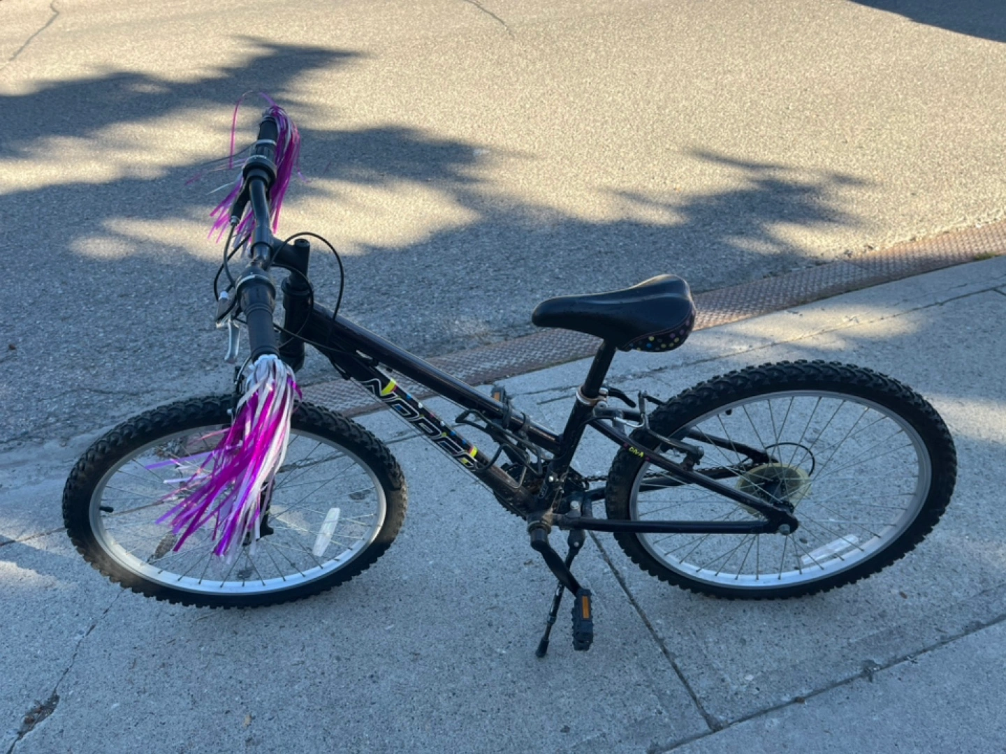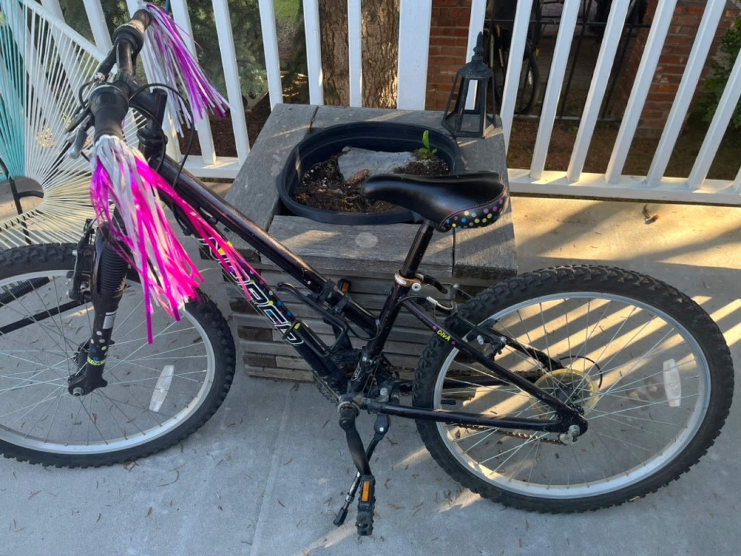 Selling a Norco DXA girls' bike in black. It's in good condition and ready for a new rider! Perfect for kids who are ready to explore the neighbourhood or hit the trails. It has fun pink and purple tassels on the handlebars!