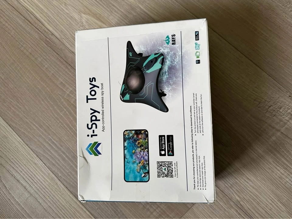 Mini wifi remote control underwater camera boat. Product size: 19*15*6cm. Lithium battery 3.7V/250mAh. Charging time: About 45 minutes. Driving time: About 15 minutes. Remote control distance: about 15 meters. Charging method: USB cable charging. Age: 8+. Features: Forward, backward, left turn, right turn, camera (10 meters), real-time transmission. Package list: 1*RC Ship, 1*Charging line, 1*Instructions. To use, download the app, place the boat in water, connect to the boat's WiFi in your phone's settings, and then open the app to control the boat.