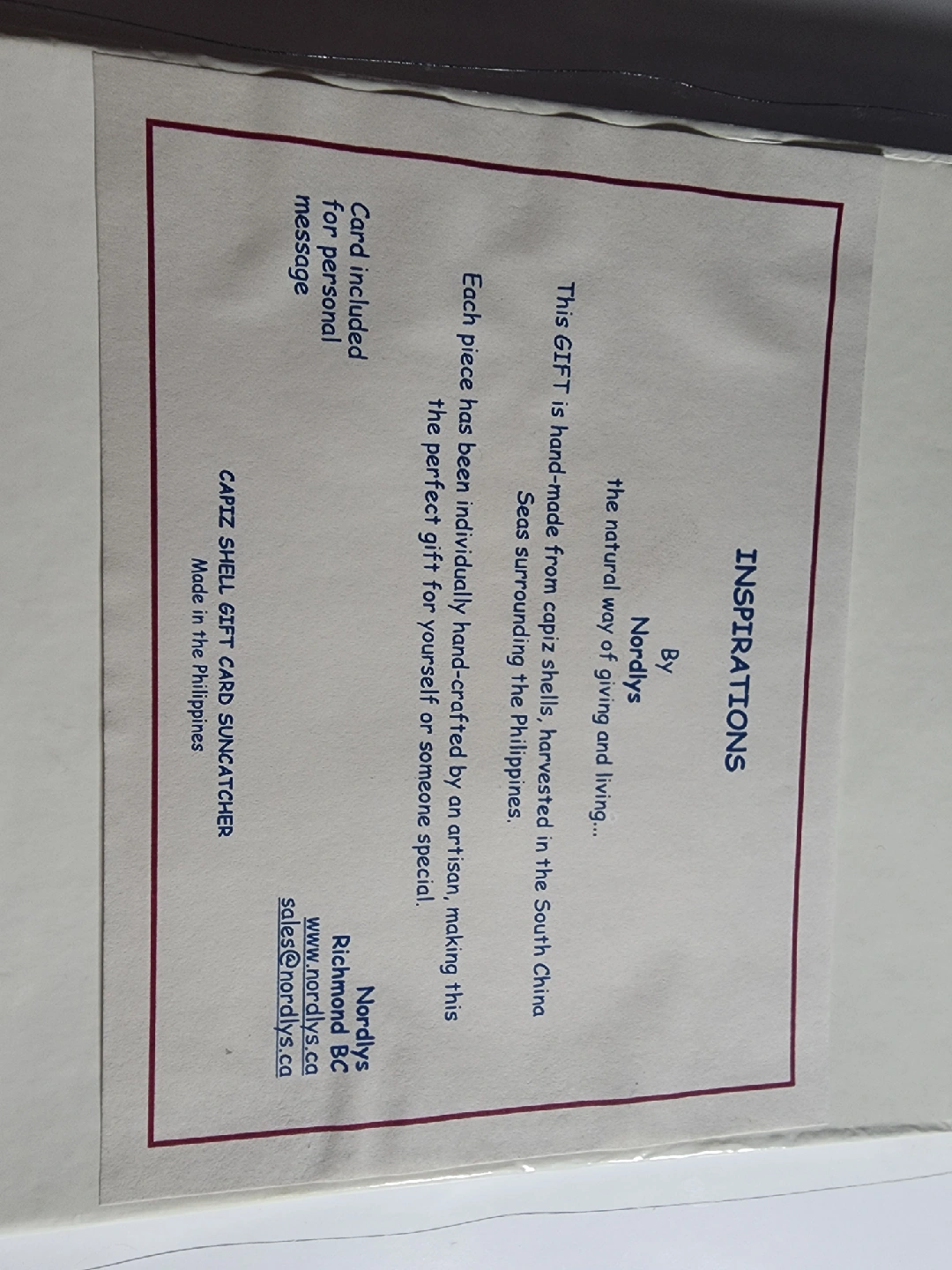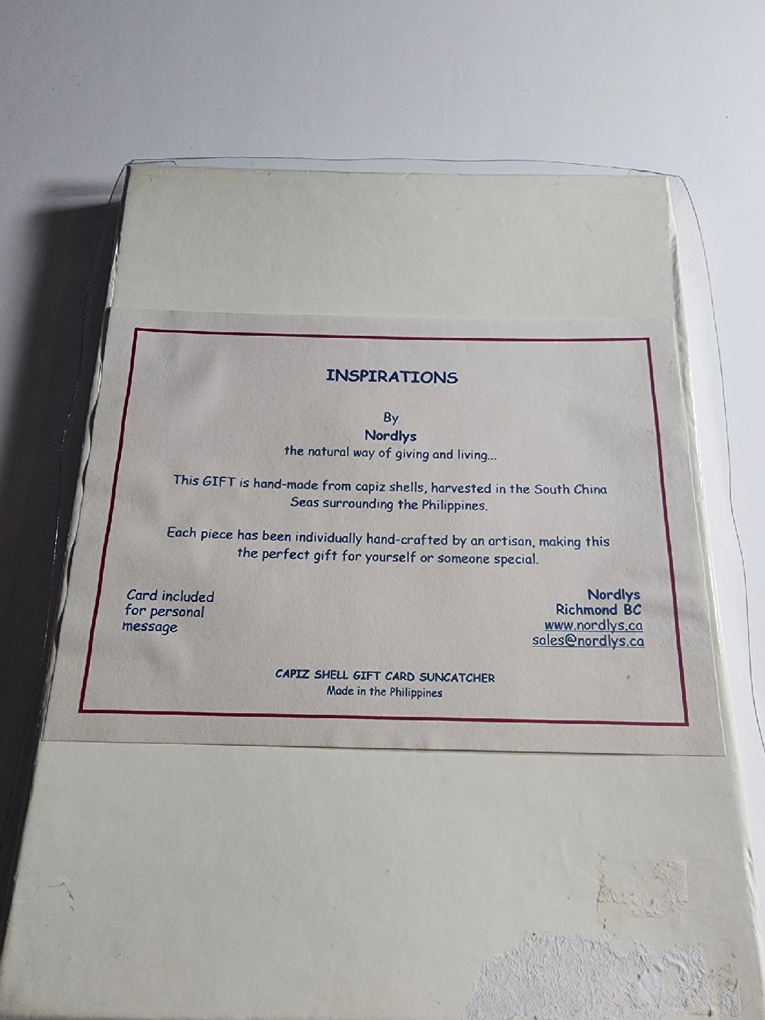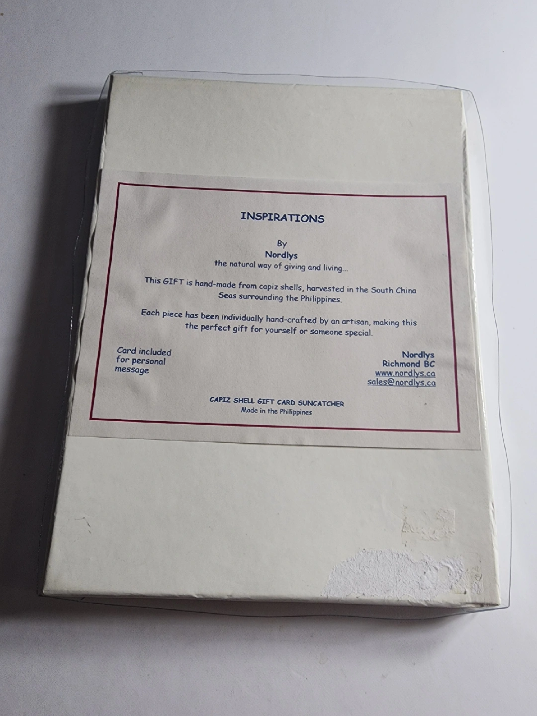 137This beautiful suncatcher by Nordlys is made from hand-made capiz shells, harvested in the South China Seas surrounding the Philippines. Each piece has been individually hand-crafted by an artisan, making this the perfect gift for yourself or someone special. Comes with a card included for a personal message