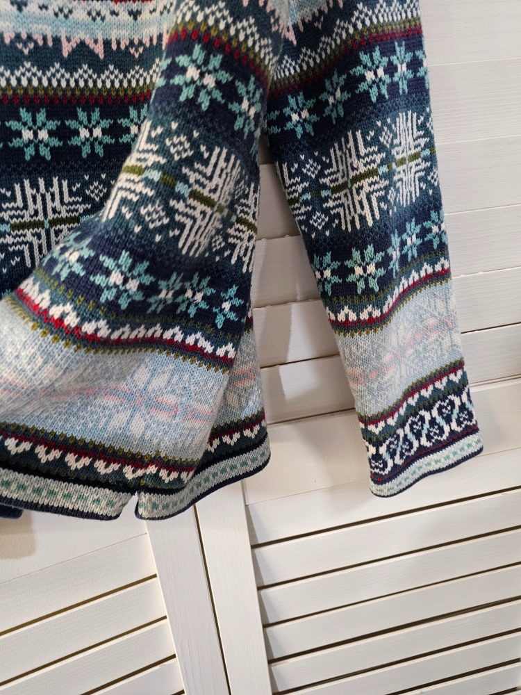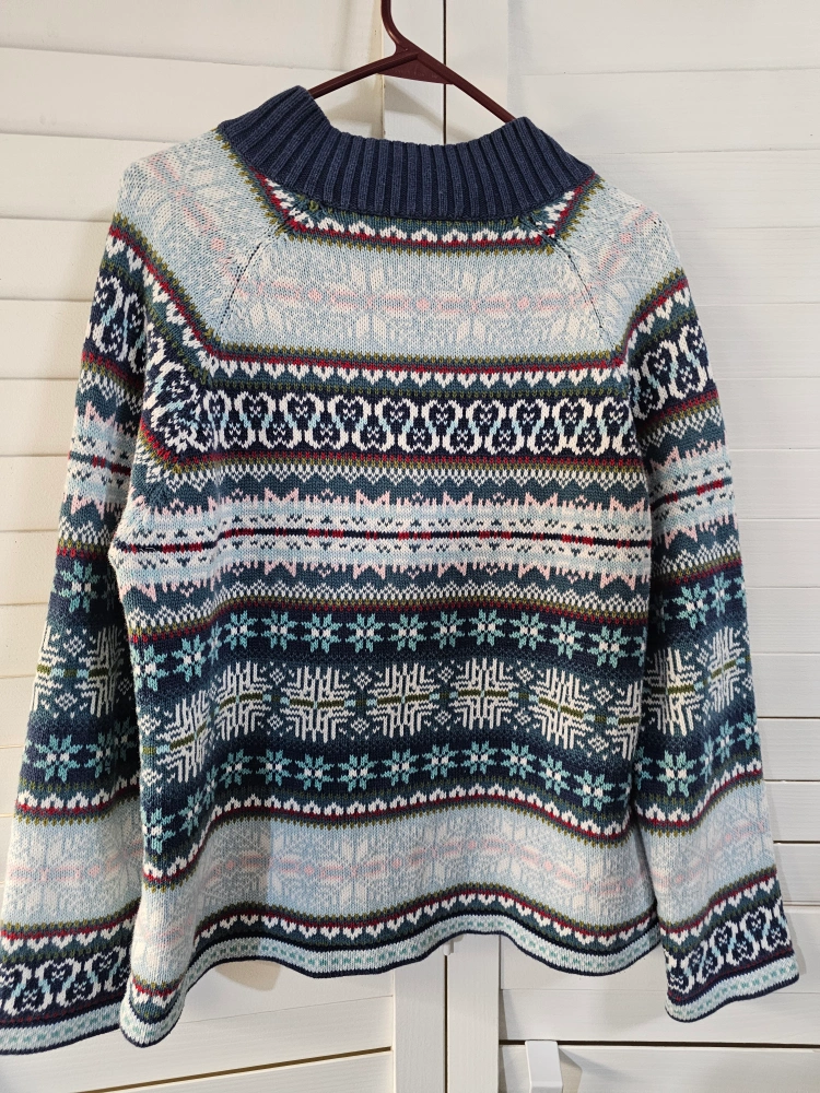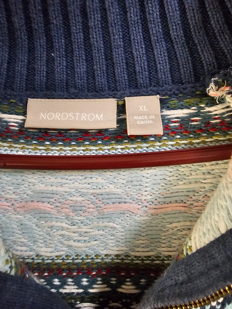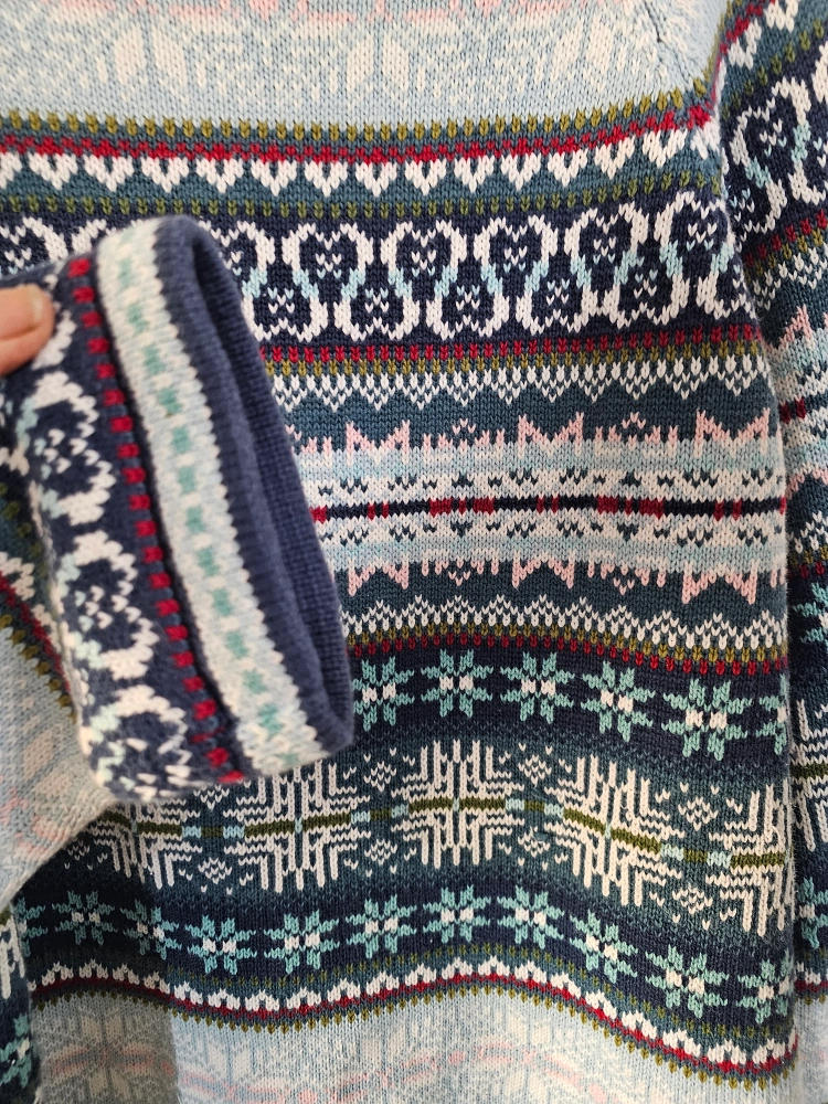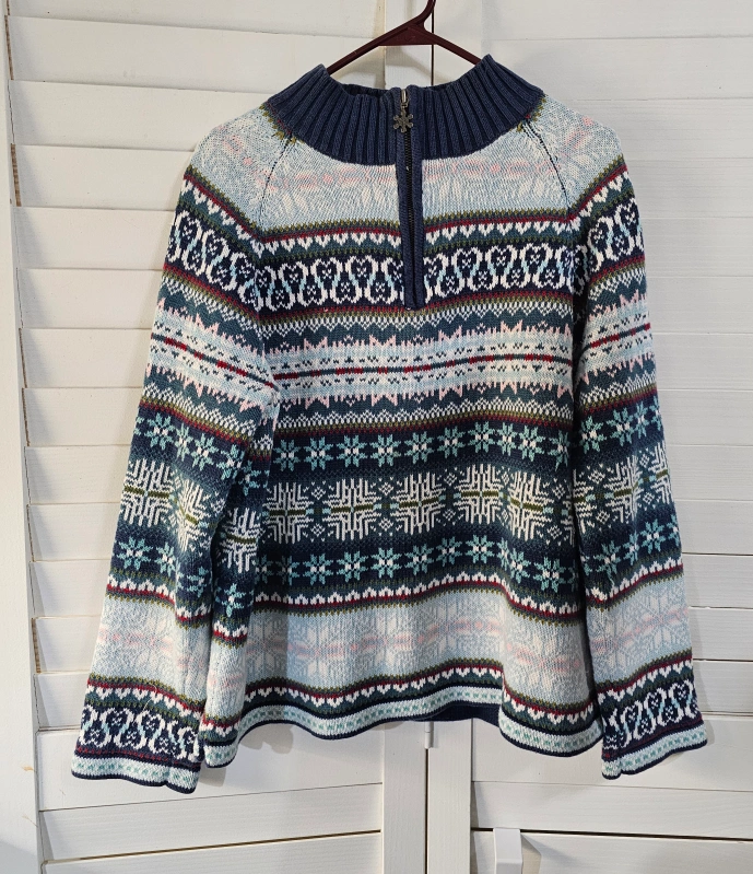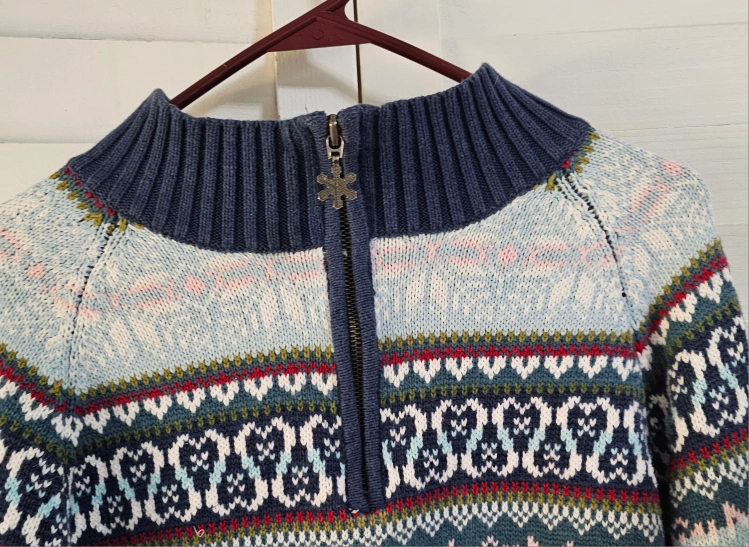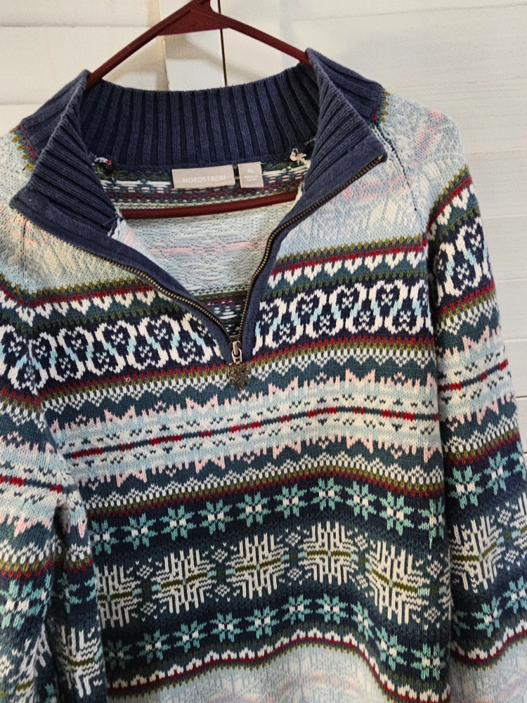 1000+A women's size XL sweater with a 1/4 zip. It has a blue, green, white, pink, and red pattern.