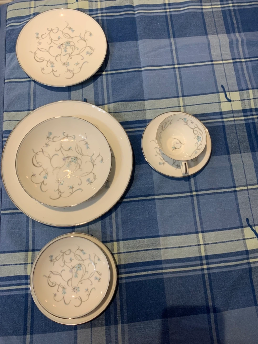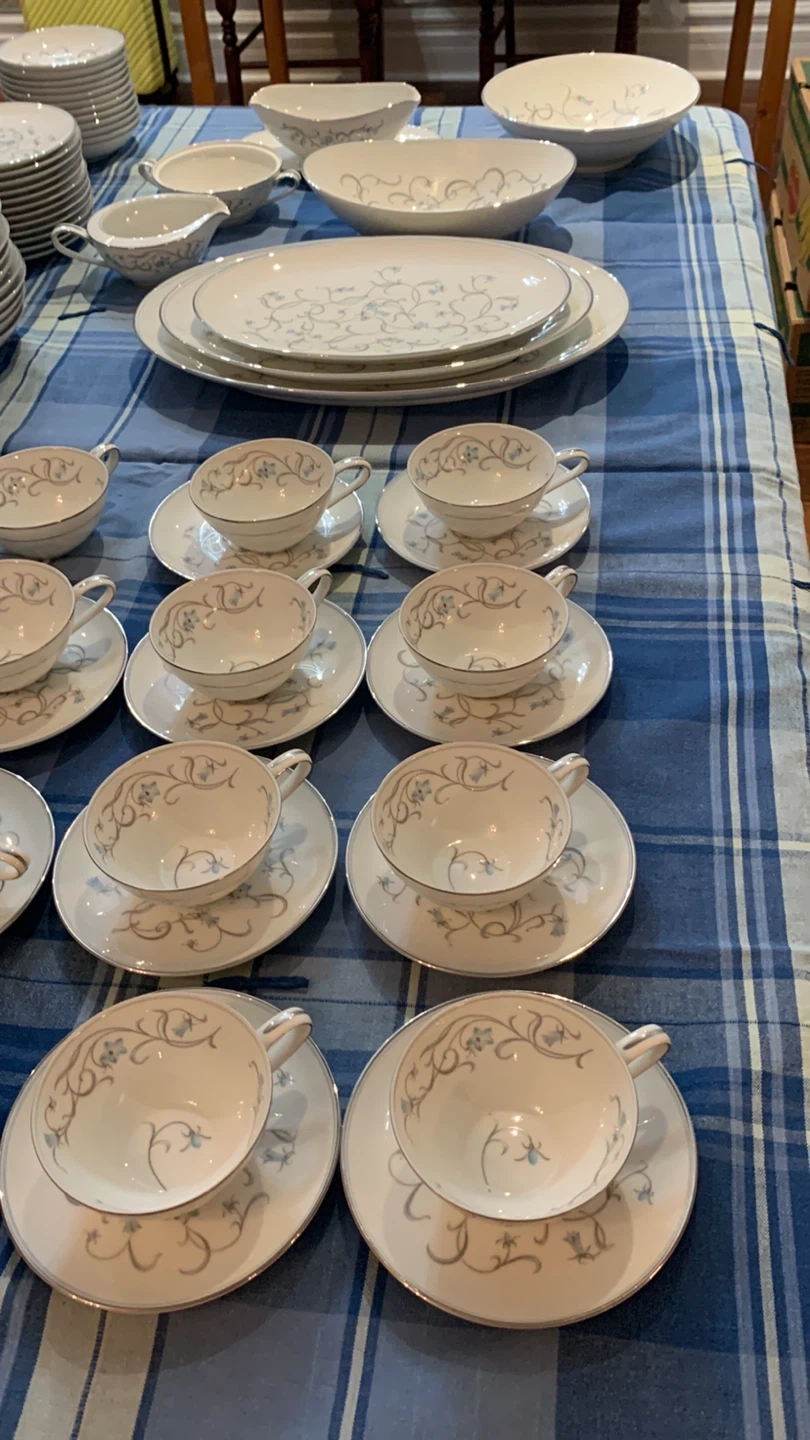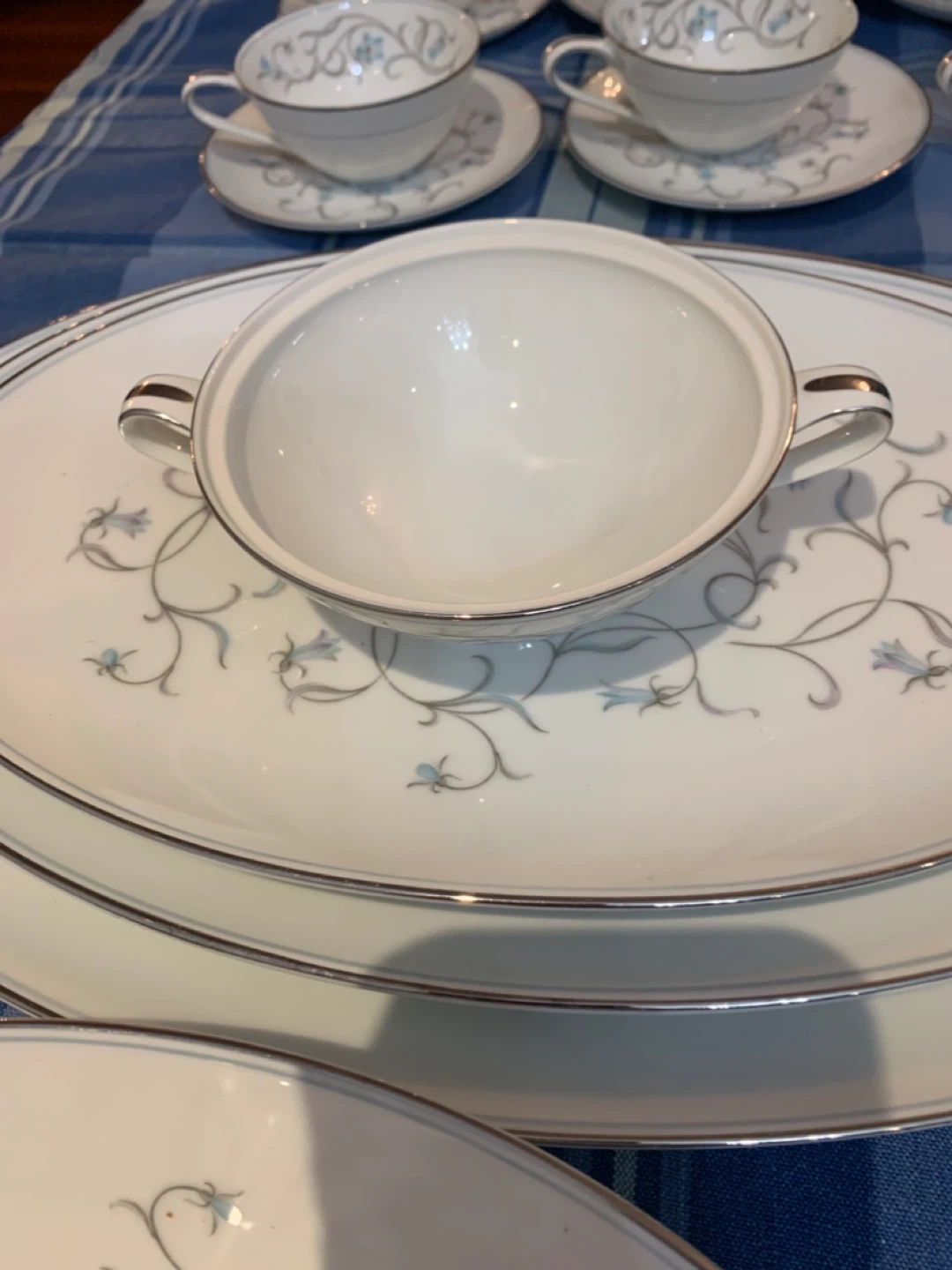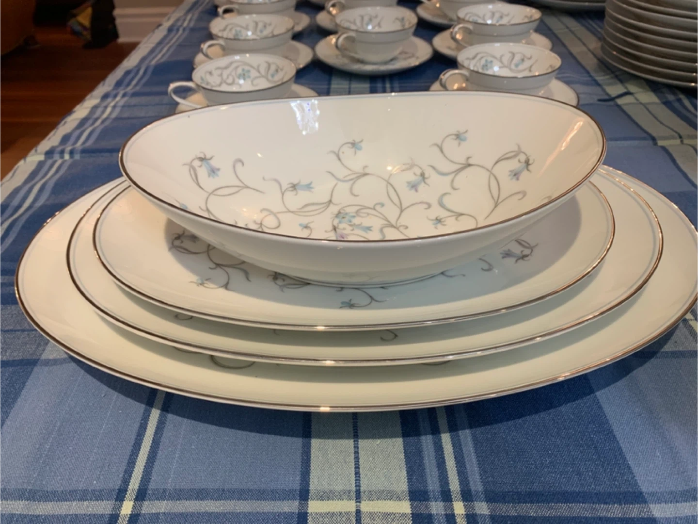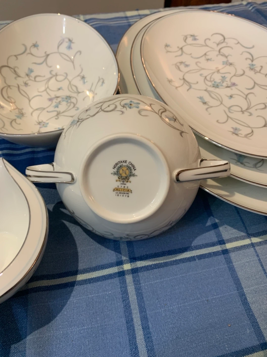 Selling a beautiful Noritake China dinnerware set in the Alicia pattern. It's in very good condition and ready to add a touch of elegance to your dining table! Price is for set of 6, it is 7 pcs X6. It can be sold as set of 12 for $300, with all those special dishes included. Otherwise, oval 3 plates, oval bowl, sauce and sugar dish are separately for $110 Gorgeous NORITAKE 5762 ALICIA, Blue Floral with Vines and Silver Trim. One of the most beautiful Noritake Vintage Full Set for 12. TOTAL 91 pieces. 12 Dinner Plates 10.5” 12 Soup/Sauce Bawls 7.5” 12 Luncheon Plates 8 1/4” 12 Bread and Butter Plates 6 1/4” 12 Salad/Berries Bawls 5 1/2” 1 Oval Serving Plate 16.5” 1 Oval Serving Plate 14 1/4” 1 Oval Serving Plate 12 1/4” 1 Round Serving Bowl 8 3/4” 1 Oval Serving Bawl 10” 1 Gravy Boat with Under-plate attached 8” 12 Tea Cups and 11 Saucers 1 Creamer 1 Sugar Bowl Lovers of a beautiful china, hurry. Rear to find full set. Very elegant with grey and blue vines. Silver rim is around each piece giving additional touch of luxury. Perfect condition, used only few times for formal dinner. It is Full Formal Diner Set for 12, rear find. Only one tea cup saucer is missing.