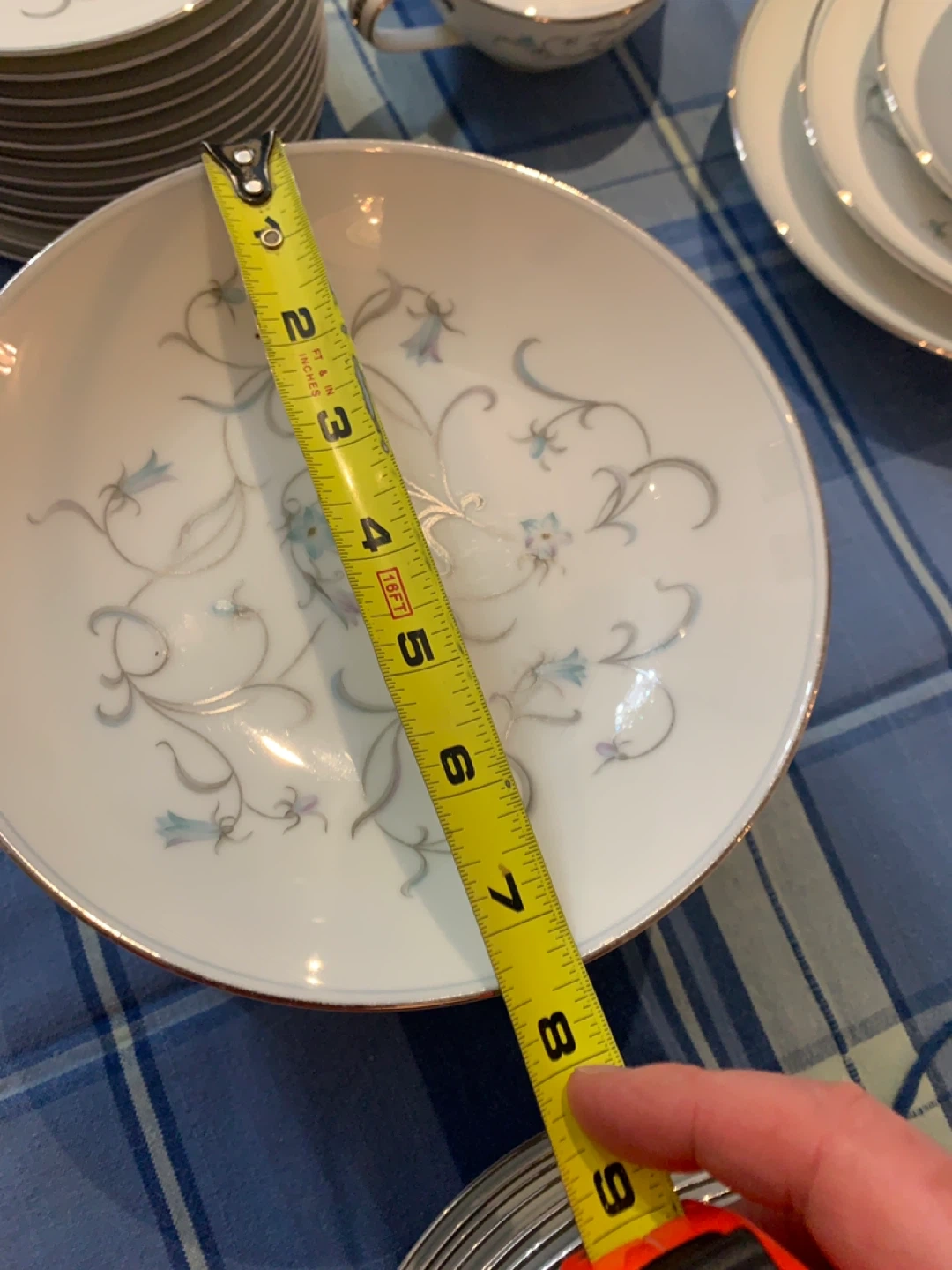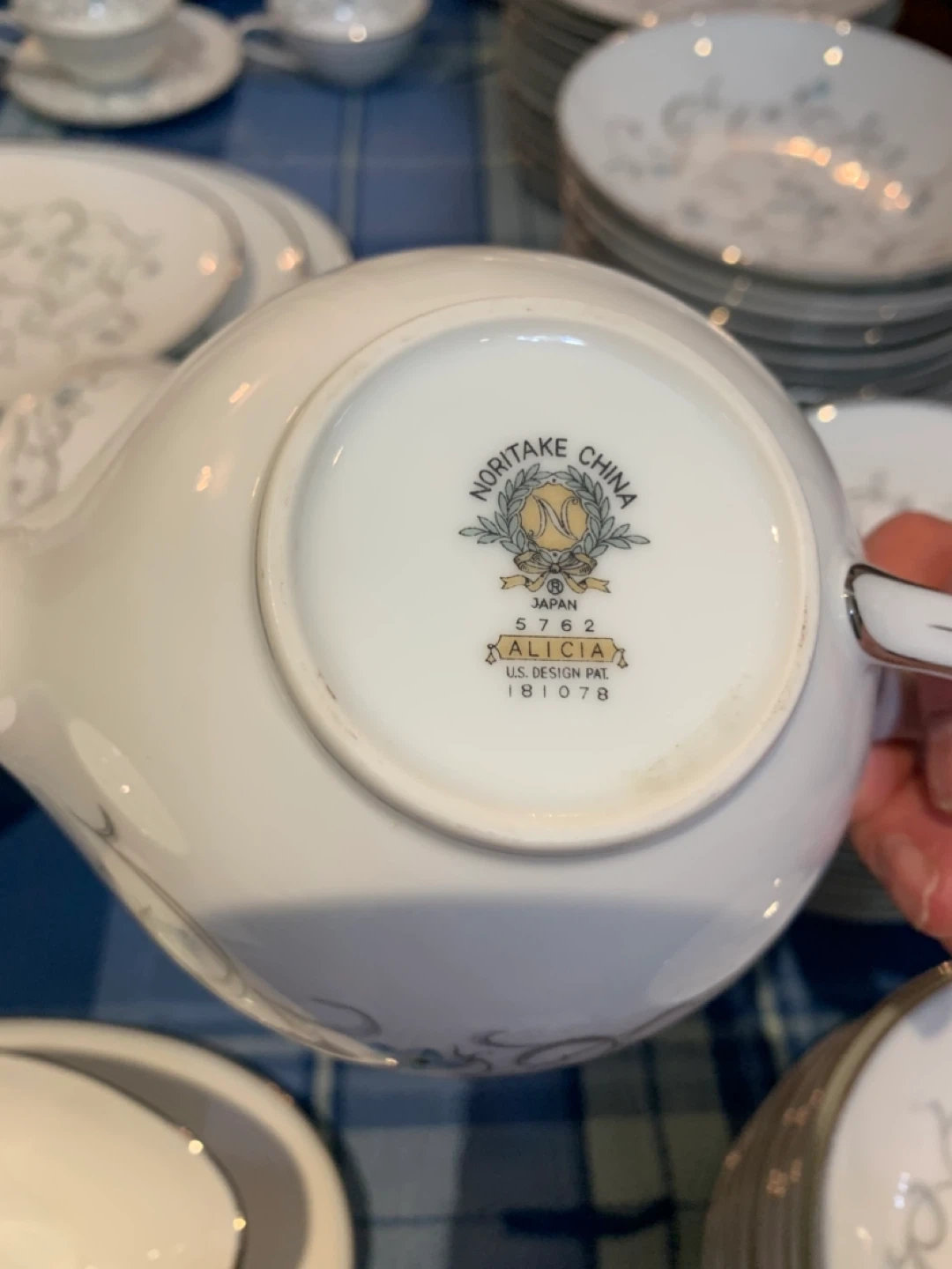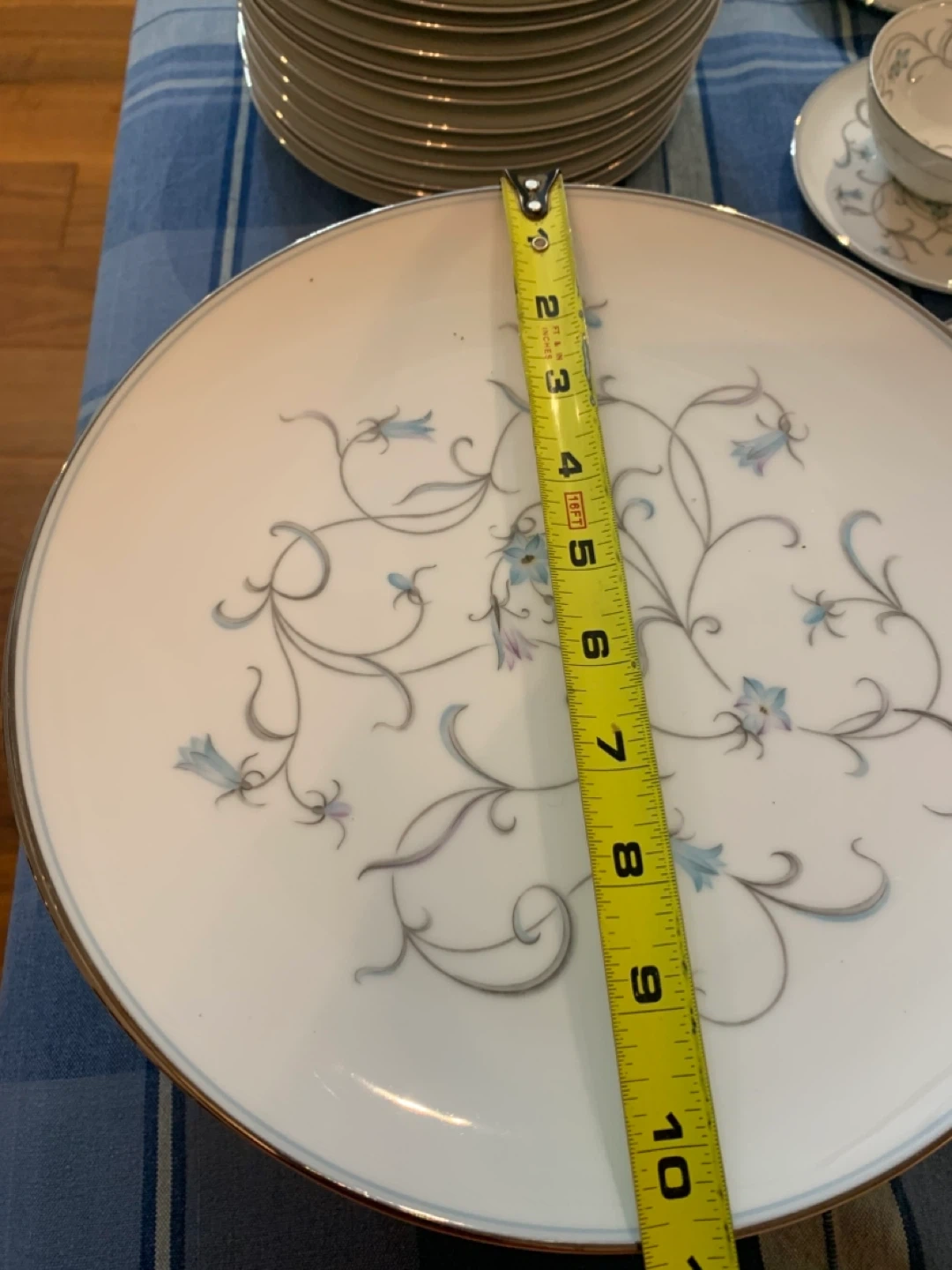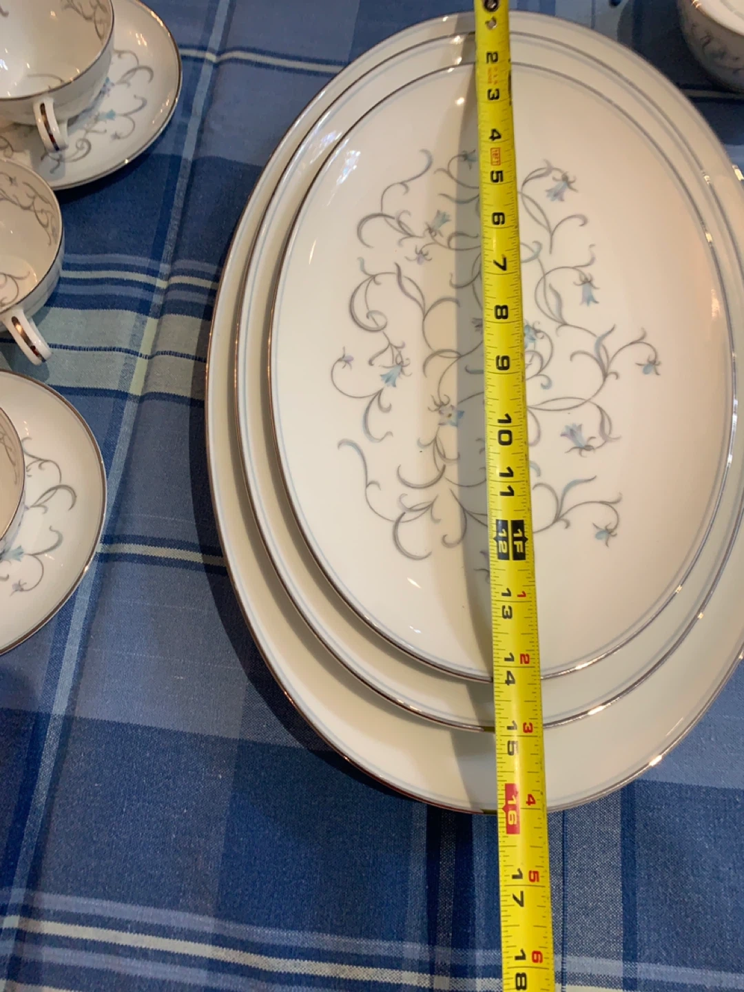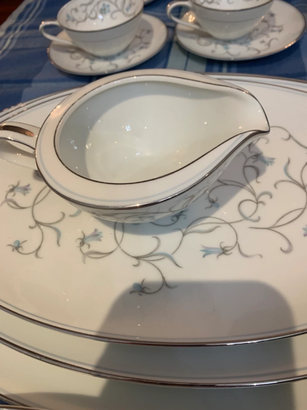 Selling a beautiful Noritake China dinnerware set in the Alicia pattern. It's in very good condition and ready to add a touch of elegance to your dining table! Price is for set of 6, it is 7 pcs X6. It can be sold as set of 12 for $300, with all those special dishes included. Otherwise, oval 3 plates, oval bowl, sauce and sugar dish are separately for $110 Gorgeous NORITAKE 5762 ALICIA, Blue Floral with Vines and Silver Trim. One of the most beautiful Noritake Vintage Full Set for 12. TOTAL 91 pieces. 12 Dinner Plates 10.5” 12 Soup/Sauce Bawls 7.5” 12 Luncheon Plates 8 1/4” 12 Bread and Butter Plates 6 1/4” 12 Salad/Berries Bawls 5 1/2” 1 Oval Serving Plate 16.5” 1 Oval Serving Plate 14 1/4” 1 Oval Serving Plate 12 1/4” 1 Round Serving Bowl 8 3/4” 1 Oval Serving Bawl 10” 1 Gravy Boat with Under-plate attached 8” 12 Tea Cups and 11 Saucers 1 Creamer 1 Sugar Bowl Lovers of a beautiful china, hurry. Rear to find full set. Very elegant with grey and blue vines. Silver rim is around each piece giving additional touch of luxury. Perfect condition, used only few times for formal dinner. It is Full Formal Diner Set for 12, rear find. Only one tea cup saucer is missing.