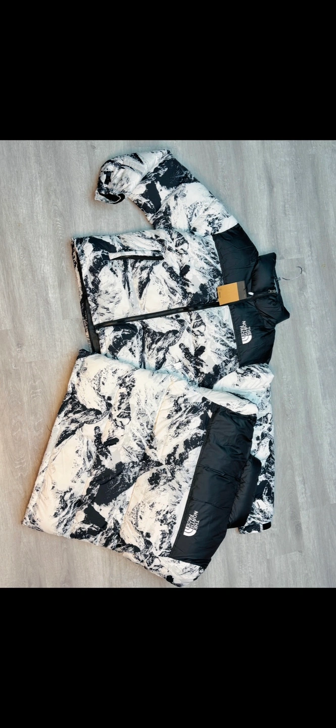 10Men's size large The North Face jackets. One black and one with a mountain print. Both appear to be puffer style.