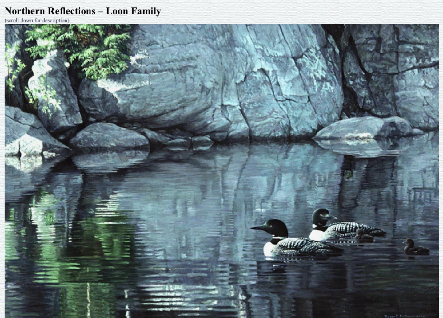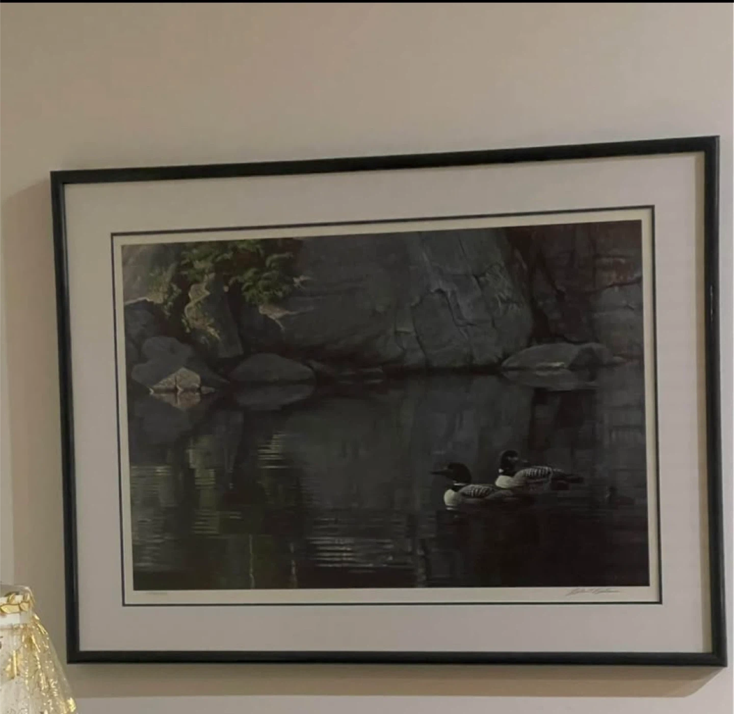 Selling a limited edition framed print titled 'Northern Reflections - Loon Family' by Robert Bateman. It depicts a serene scene of loons on a lake with rocky landscapes. A lovely piece for any home!