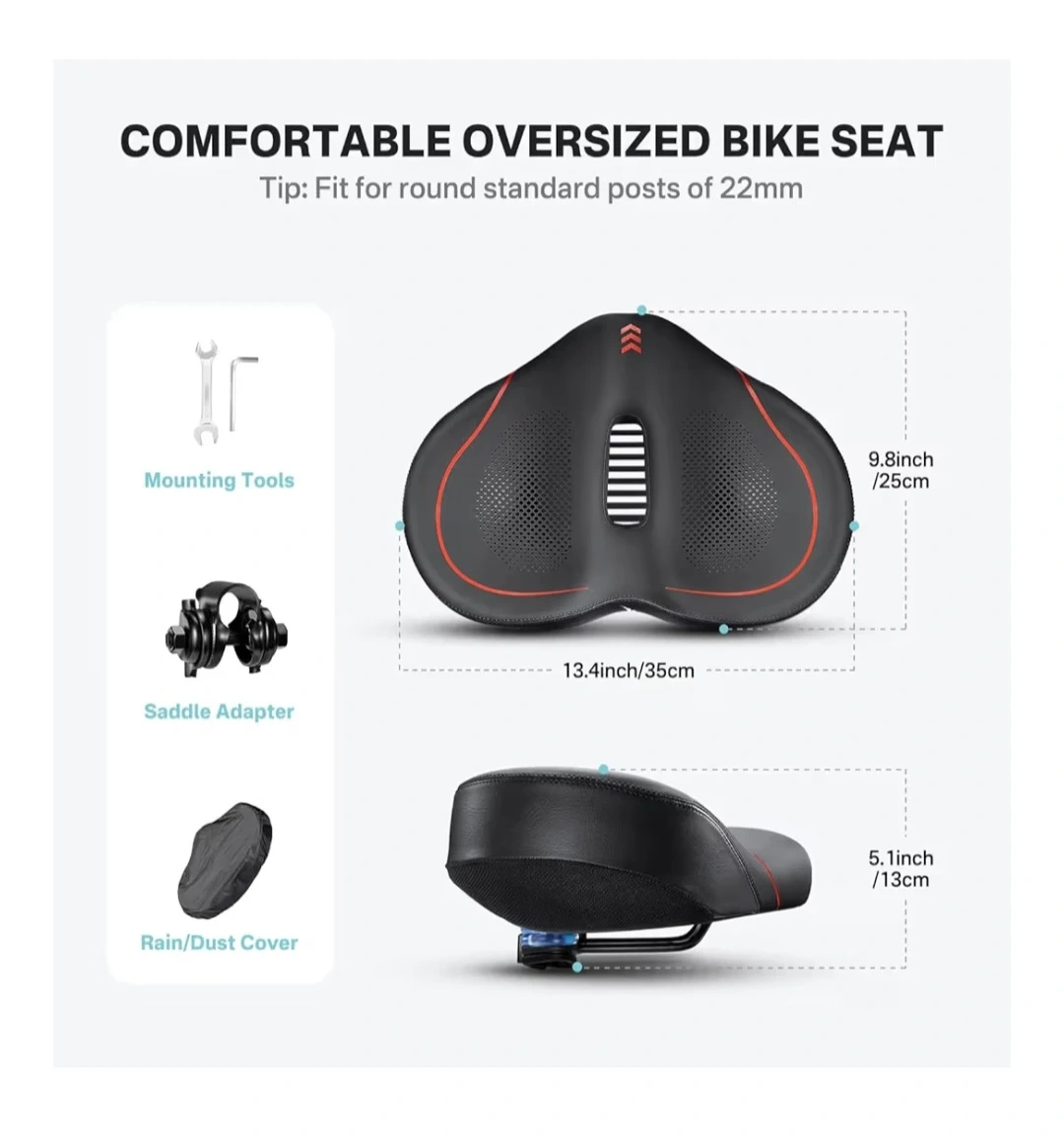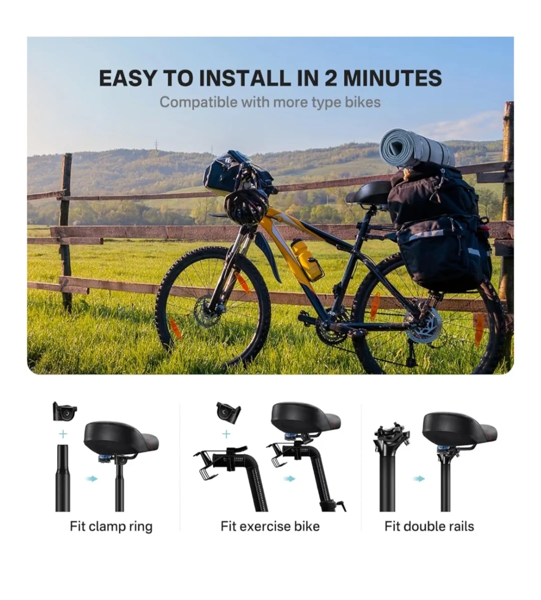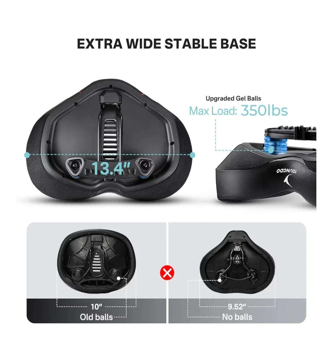 16This is a nose-less bike seat cushion. It's designed to reduce friction between the thighs and the cushion for added comfort to any ride. It features strong dual shock absorbing balls for excellent elasticity and strong shock absorption for a more stable ride. The hollow-out design is breathable, reducing pressure on private parts and making cycling cooler. It's easy to install in 2 minutes and compatible with most bike types. The base is extra wide and stable, with upgraded gel balls and a max load of 350lbs