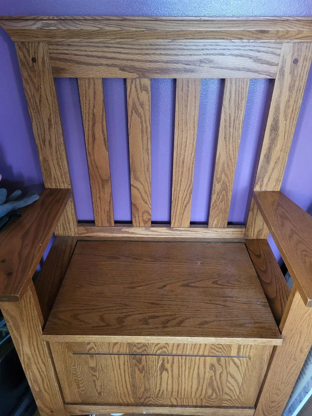 Solid wood storage chest. It's great for keeping blankets or other items tucked away. Features a lift-top lid with metal clasp. Excellent condition