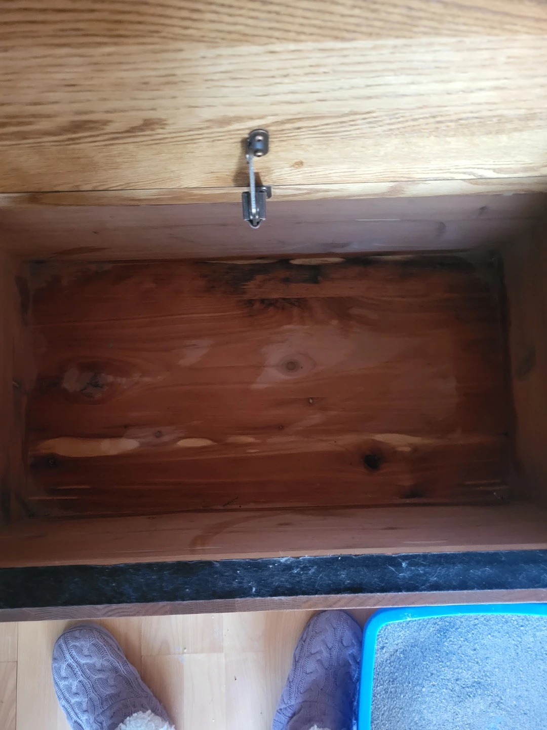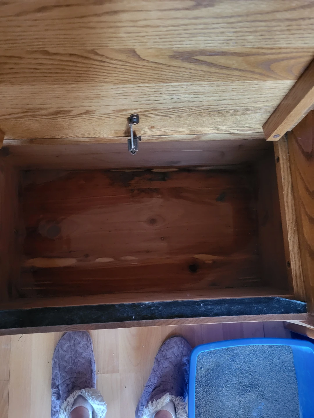 Solid wood storage chest. It's great for keeping blankets or other items tucked away. Features a lift-top lid with metal clasp. Excellent condition