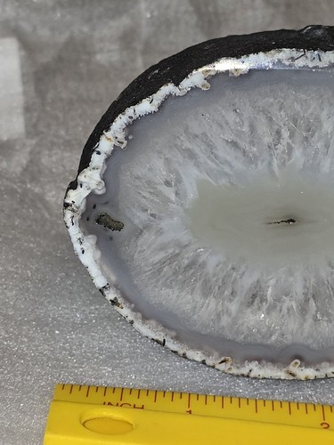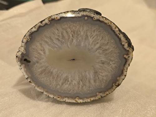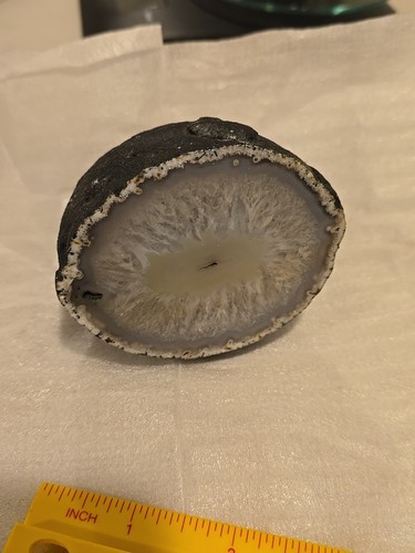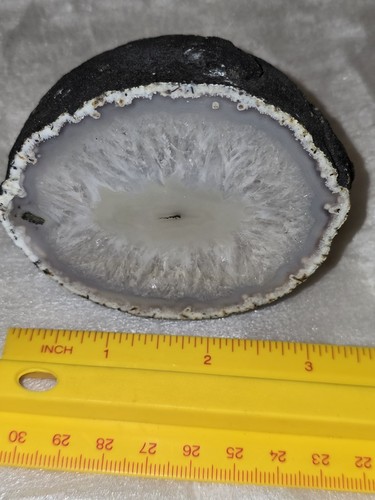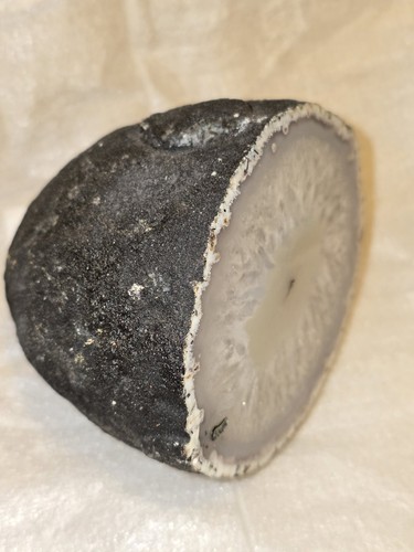 This is a unique and eye-catching display specimen that showcases the beauty of natural agate formations. It's a half eye slice of a geode, revealing stunning details and patterns within the rock. Its black exterior adds a touch of elegance and contrast to the intricate interior structures, making it a great addition for collectors or those interested in rocks, fossils, and minerals.