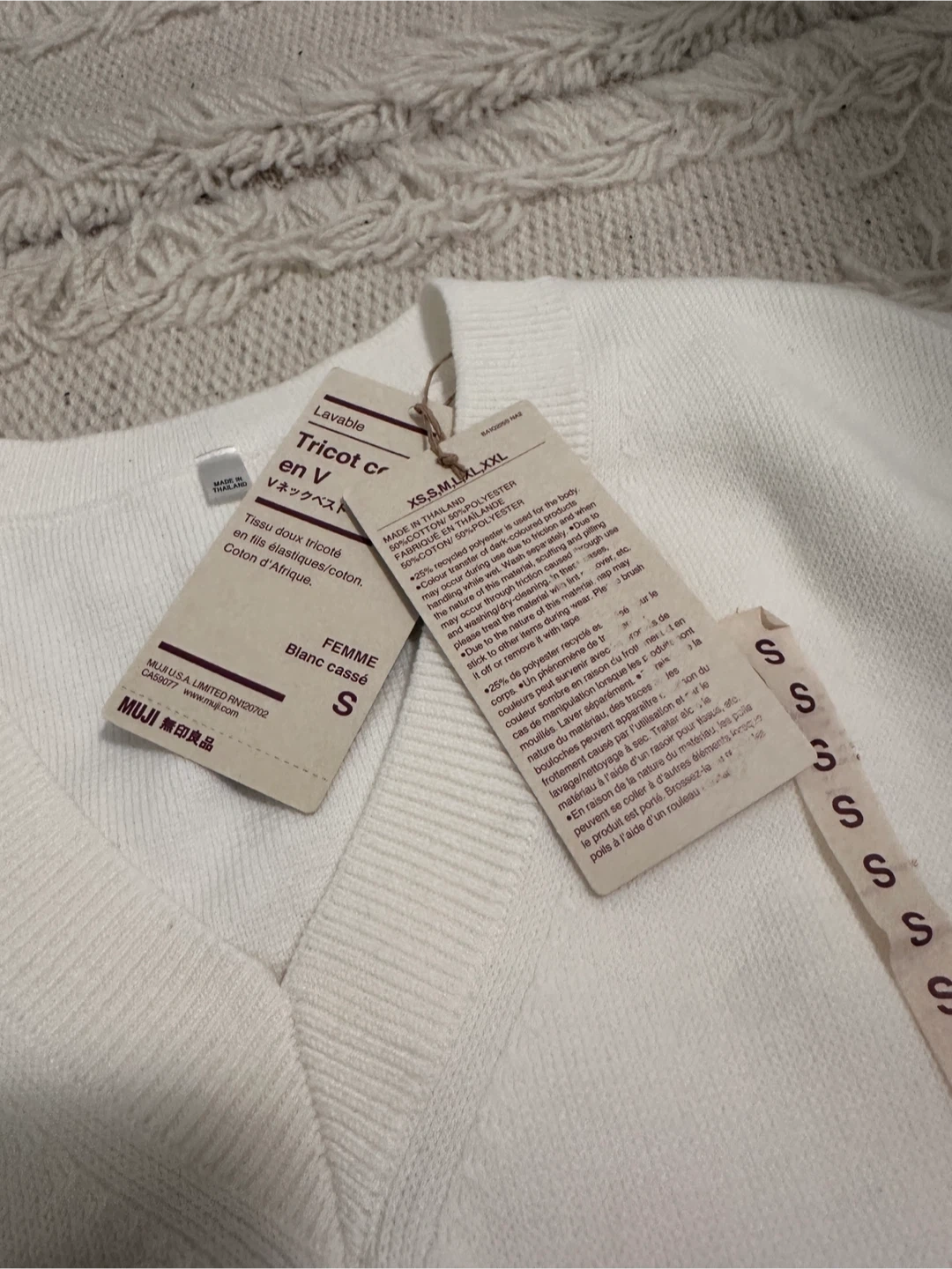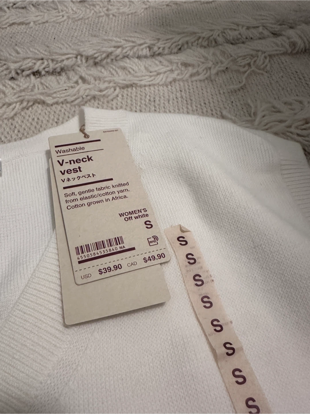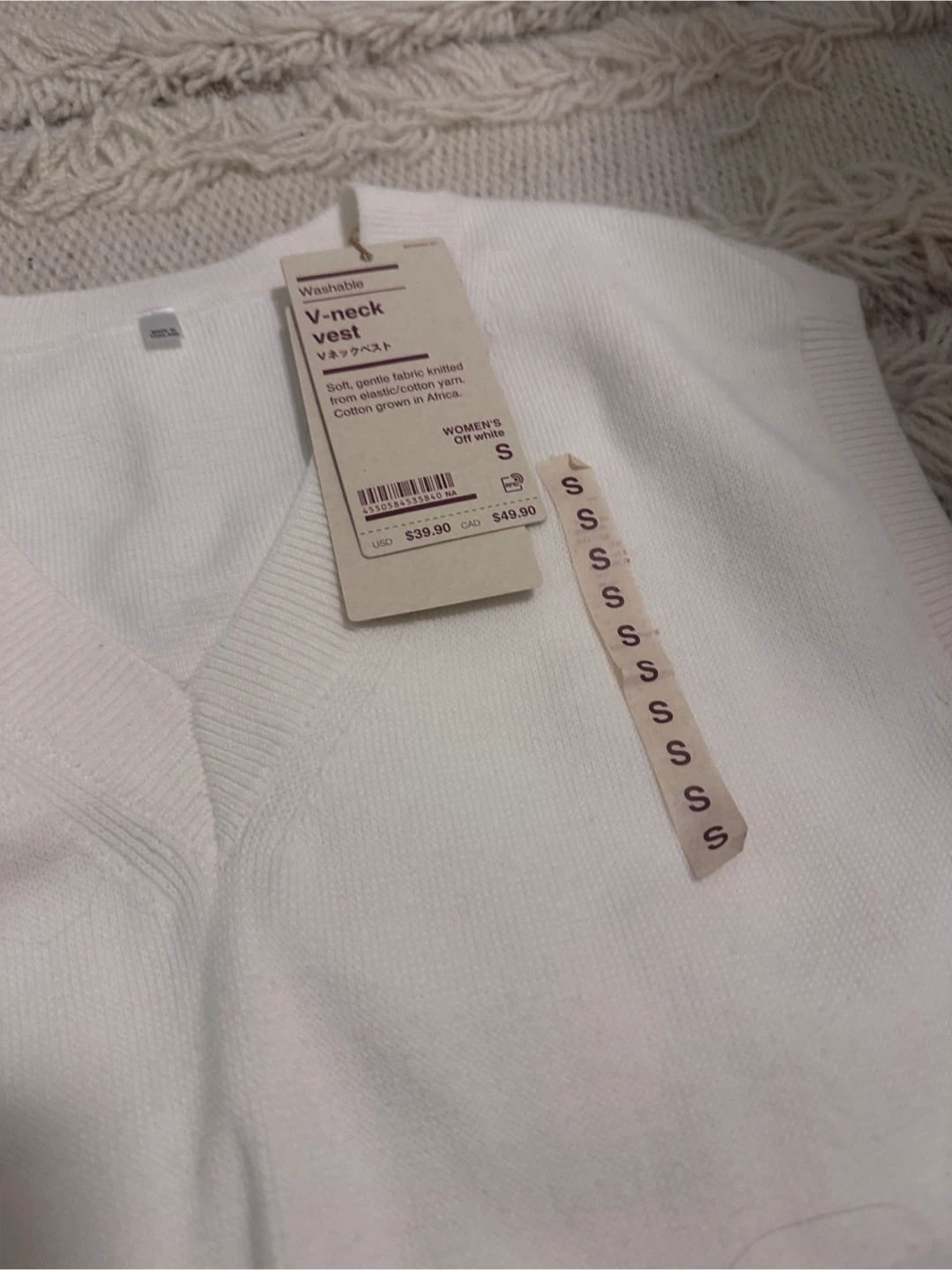 NEW Muji V-neck vest in off-white. Soft, gentle fabric knitted from elastic/cotton yarn. Front ‘S’ sticker is peeling off, but it has never been worn. Purchased for $50 before tax. New with tags. No stains/tears/holes, pet-free and smoke-free household. Pickup at 403 Church St, cash ONLY.