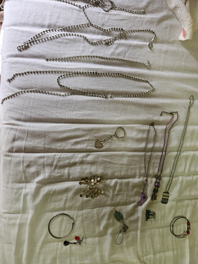 Assortment of necklaces, bracelets, earrings, and a keychain.