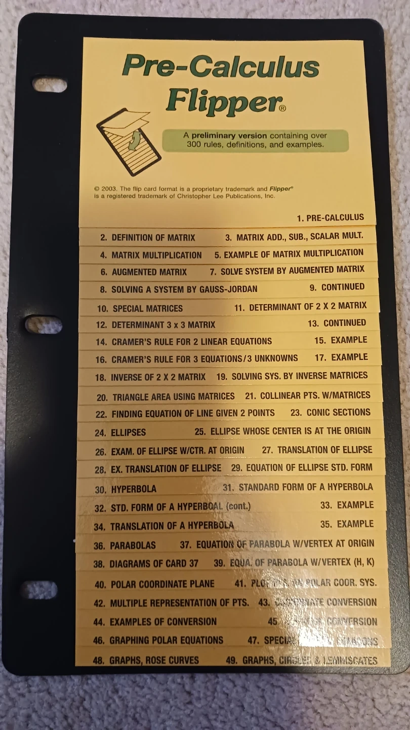 Perfect "cheat sheet" for high school or college students! This Pre-Calculus Flipper by Christopher Lee Publications is a durable, easy-to-use reference tool that fits right into a 3-ring binder.