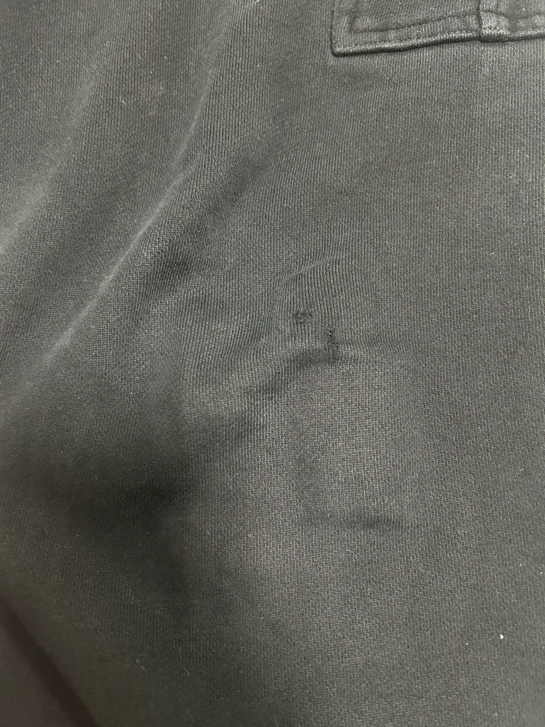 The black have no stains, but have a small rip in the knee that have been sewn together and have a patch.