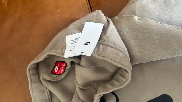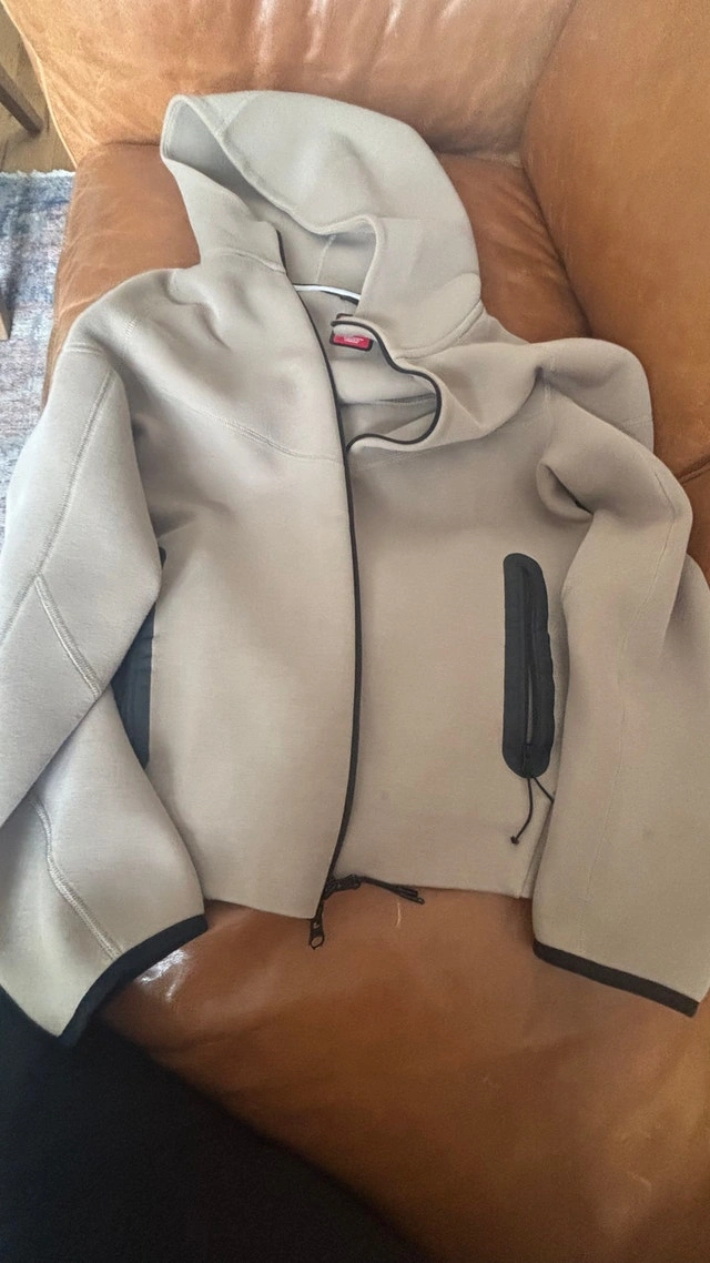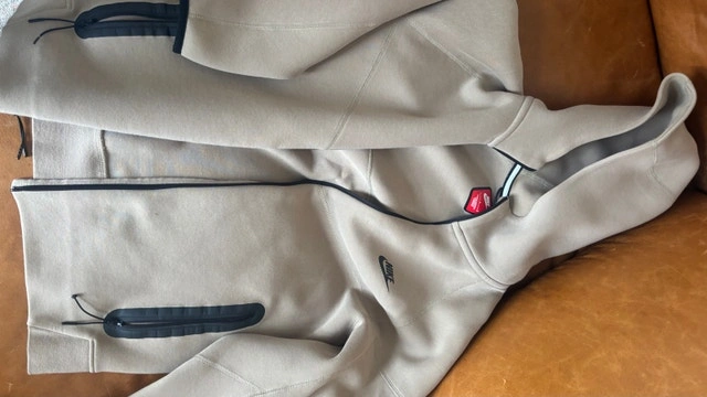 This is a Nike Tech Fleece size large hoodie, perfect for workouts or everyday wear. It's in excellent condition, worn once, and has a comfortable fit. The hoodie features a full zip, a paneled hood, and two side pockets. Brand: Nike. Style: Tech Fleece Hoodie. Size: Please see photos for size tag. Closure: Zip. Cash accepted. Cashless payment accepted.