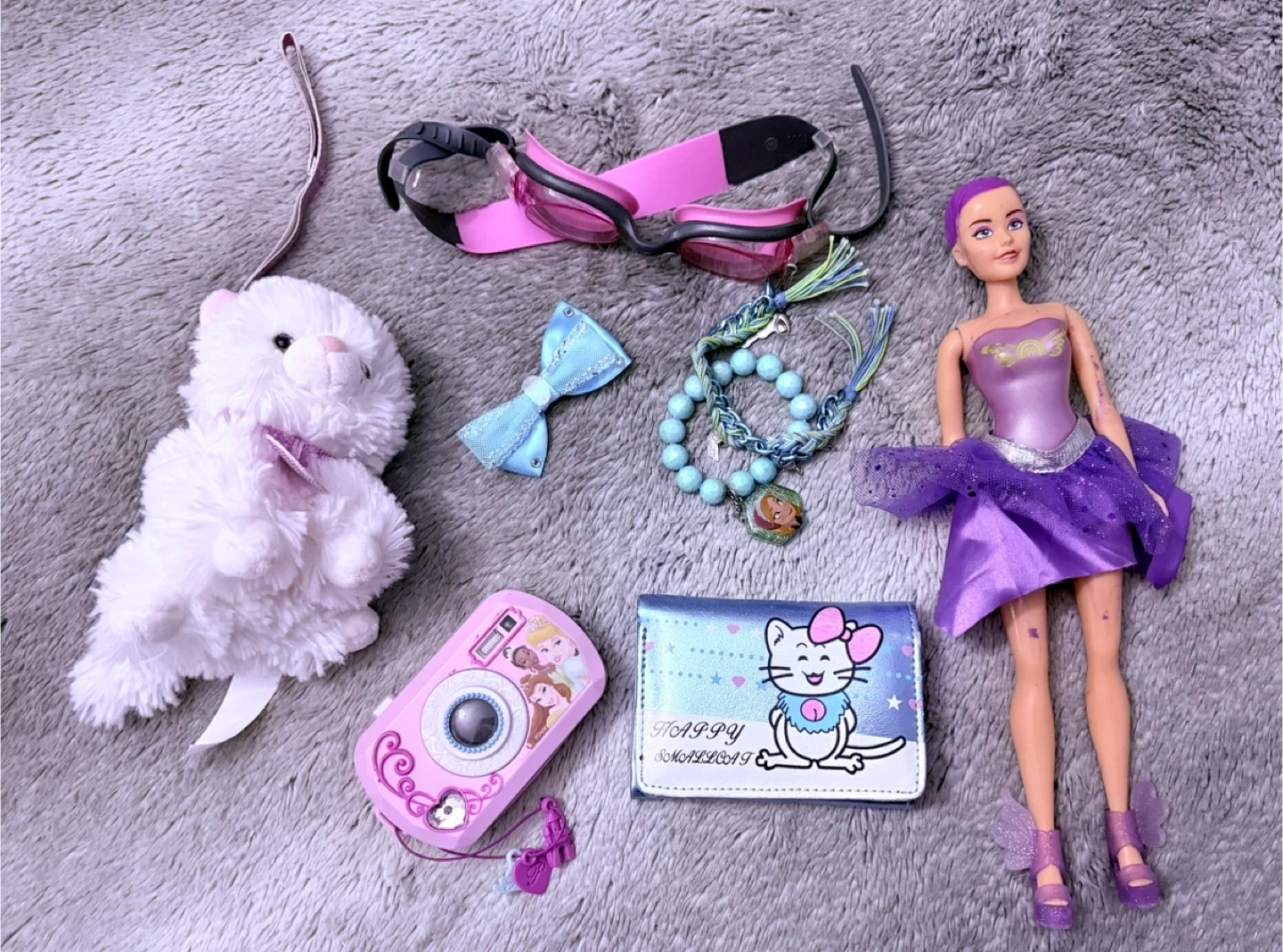 This lot includes a doll, a wallet, bracelets, goggles, and a toy camera. The doll is dressed in a purple ballet outfit. The wallet features a 'Happy Smallcat' design. Accessories like the goggles and camera are also included.
