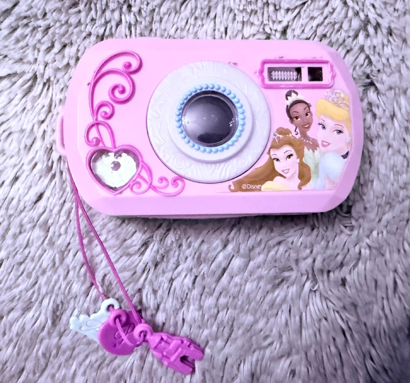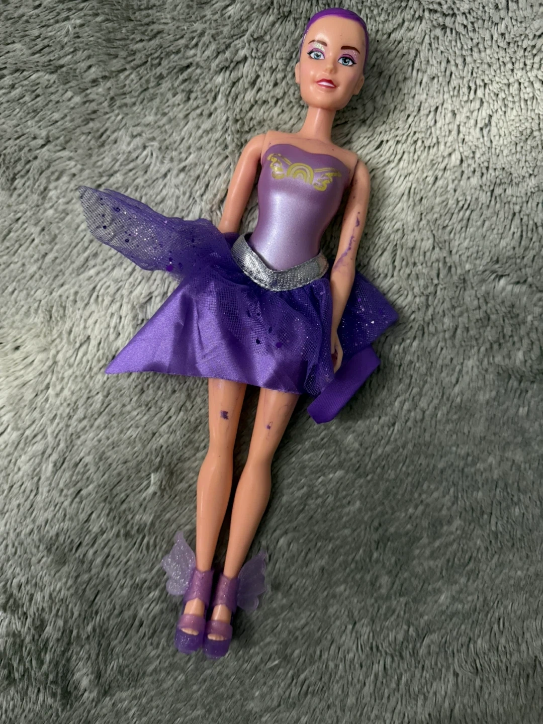 This lot includes a doll, a wallet, bracelets, goggles, and a toy camera. The doll is dressed in a purple ballet outfit. The wallet features a 'Happy Smallcat' design. Accessories like the goggles and camera are also included.