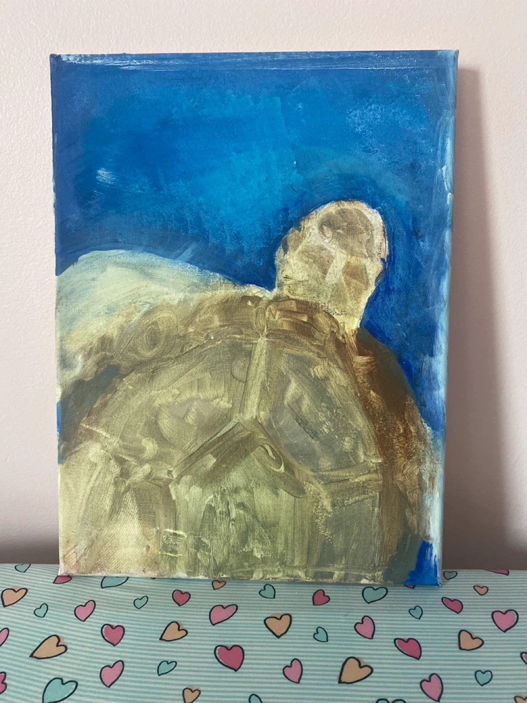 Acrylic painting of a turtle swimming in blue water. It's on a canvas with a brown and green shell detail. Perfect for adding a touch of art to any room!