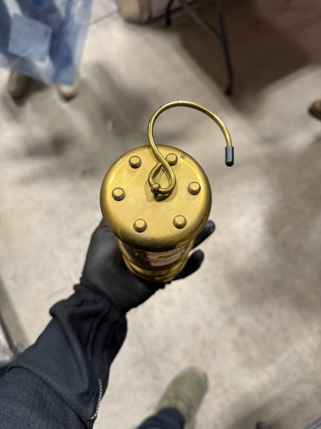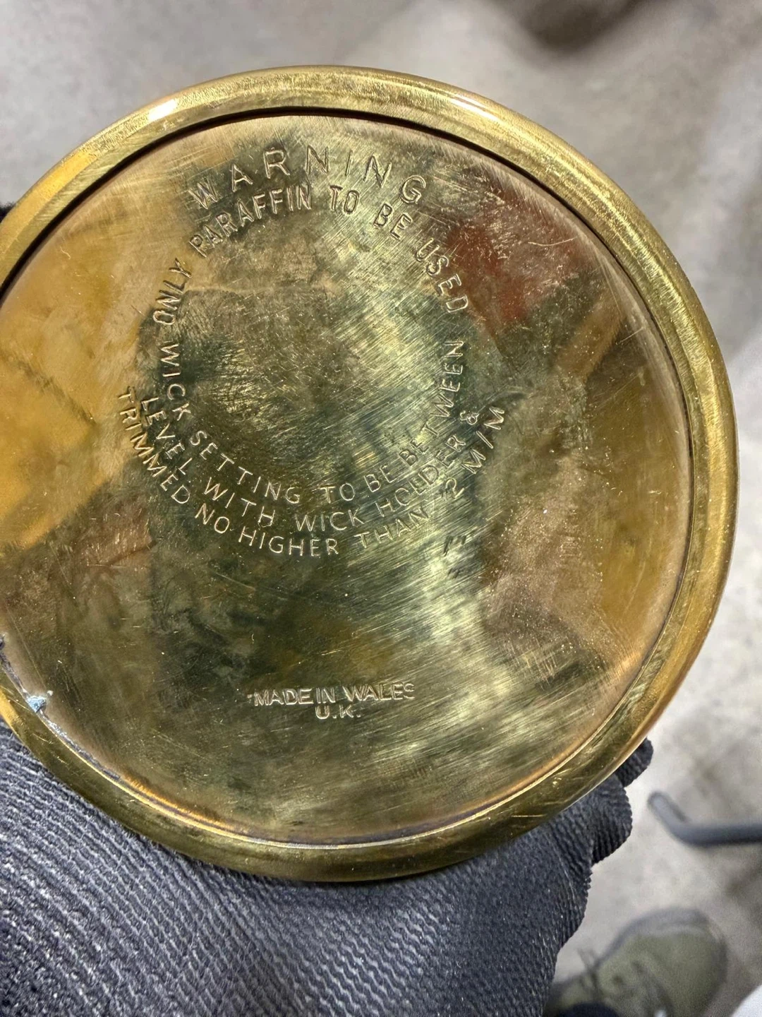 This is a brass Type Vale coal mining lamp from the Aberaman Colliery Company, Wales. It's a vintage piece, made in Wales, U.K. The lamp is designed for paraffin fuel and has specific instructions for wick setting and trimming. It's a collectible item for enthusiasts or as a unique decorative piece.