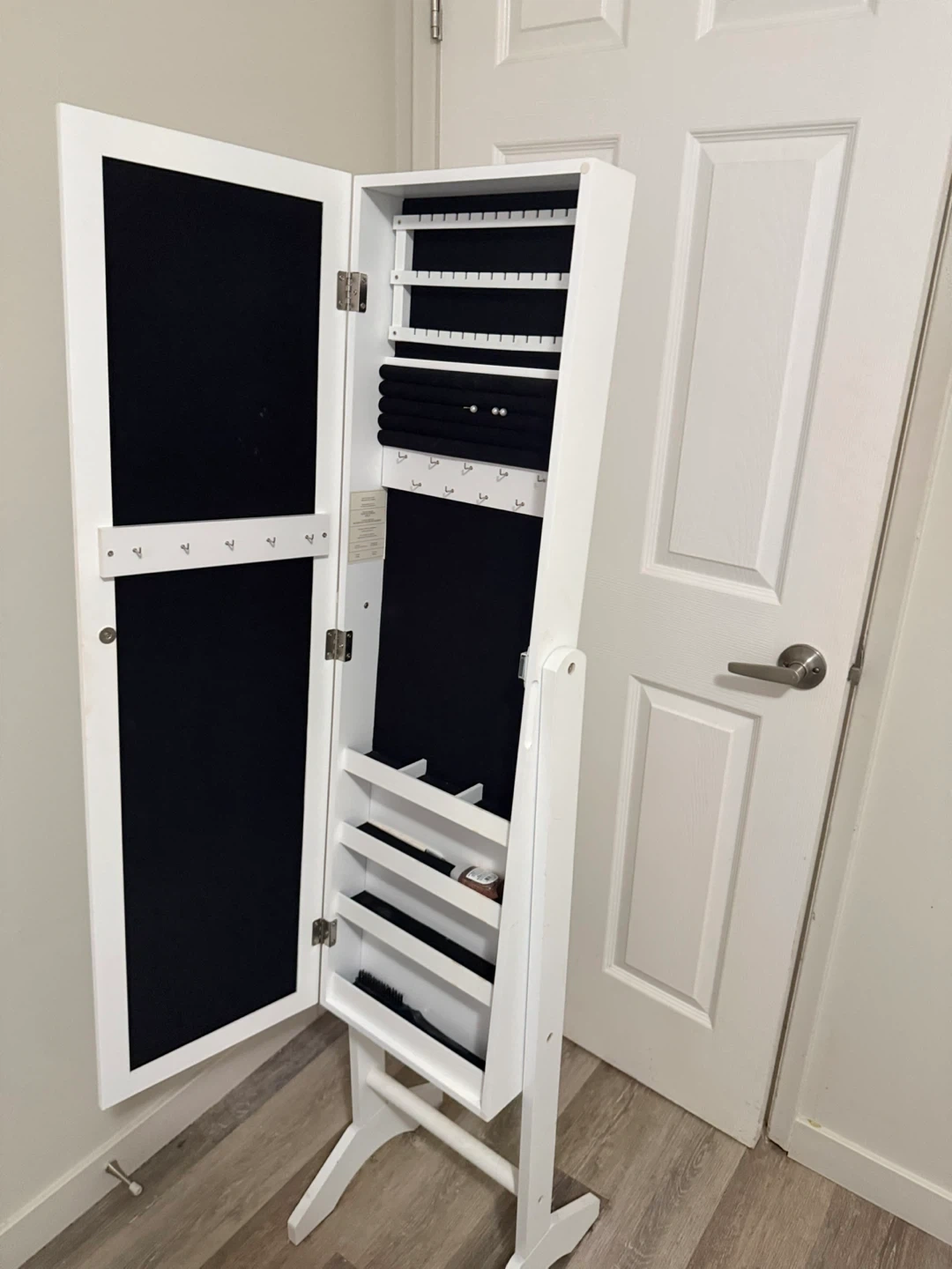 This standing jewelry armoire features a full-length mirror on the front. Inside, it offers ample storage with shelves and compartments for organizing your jewelry. It's made of wood and has a clean white finish.