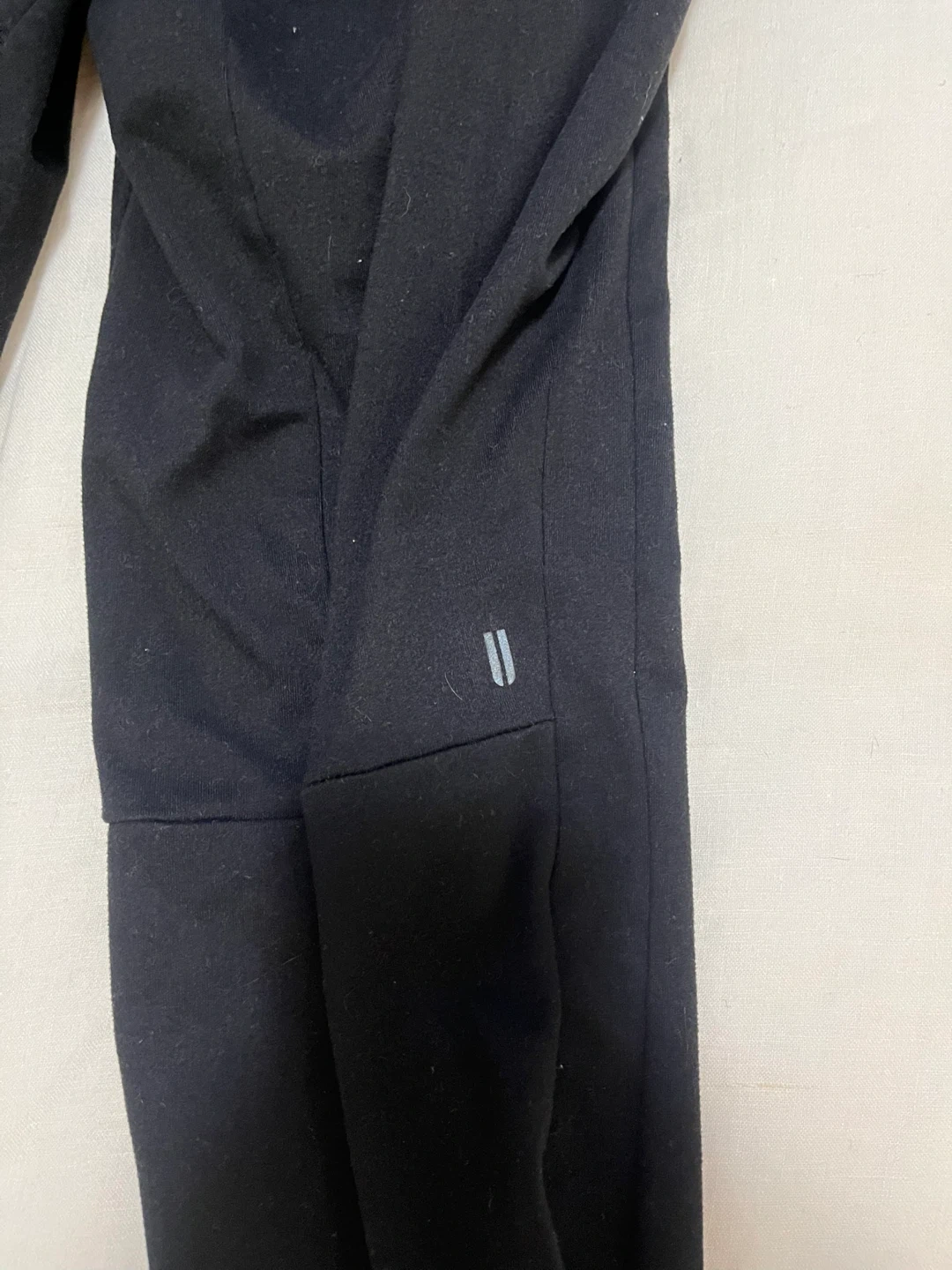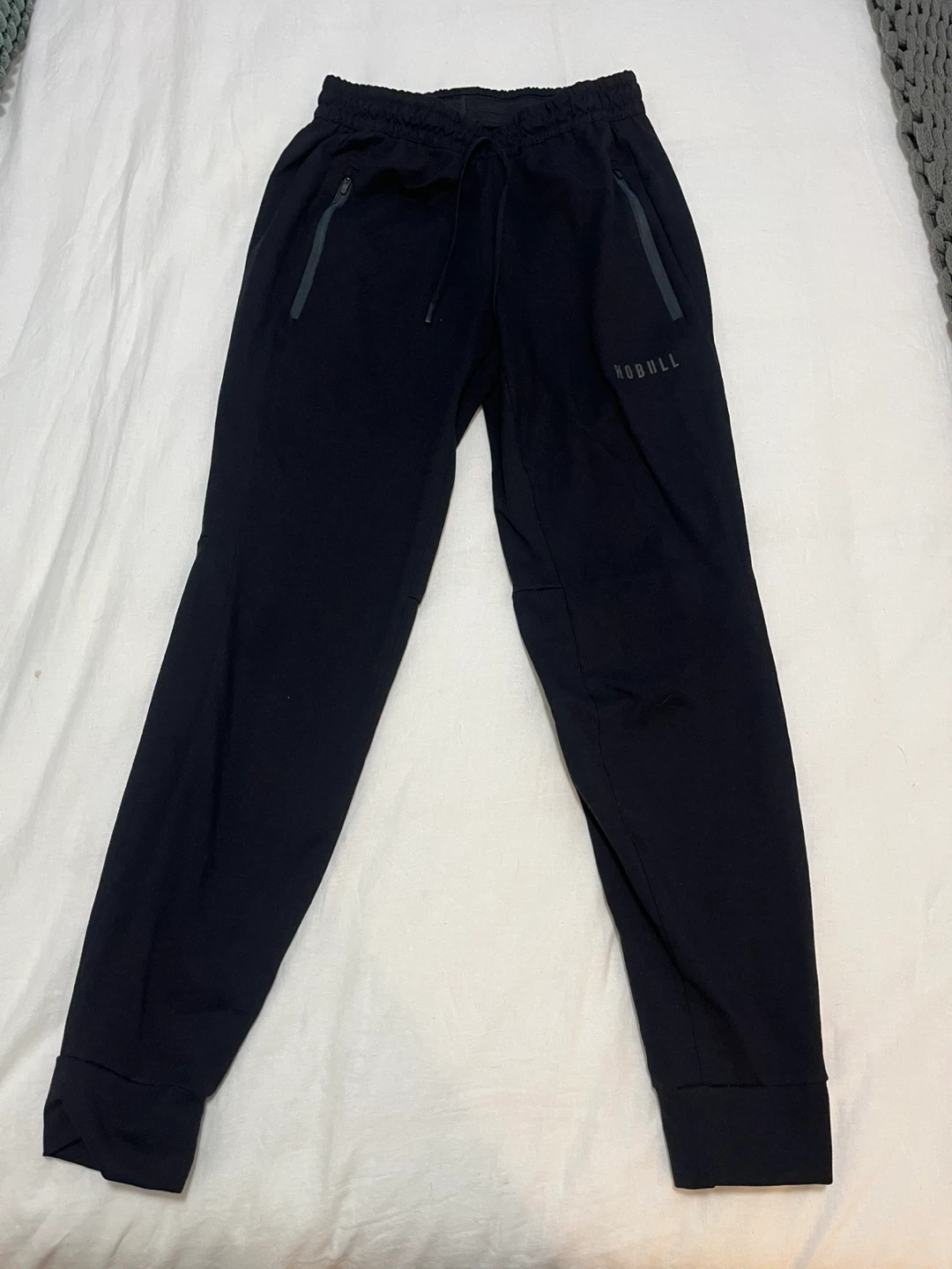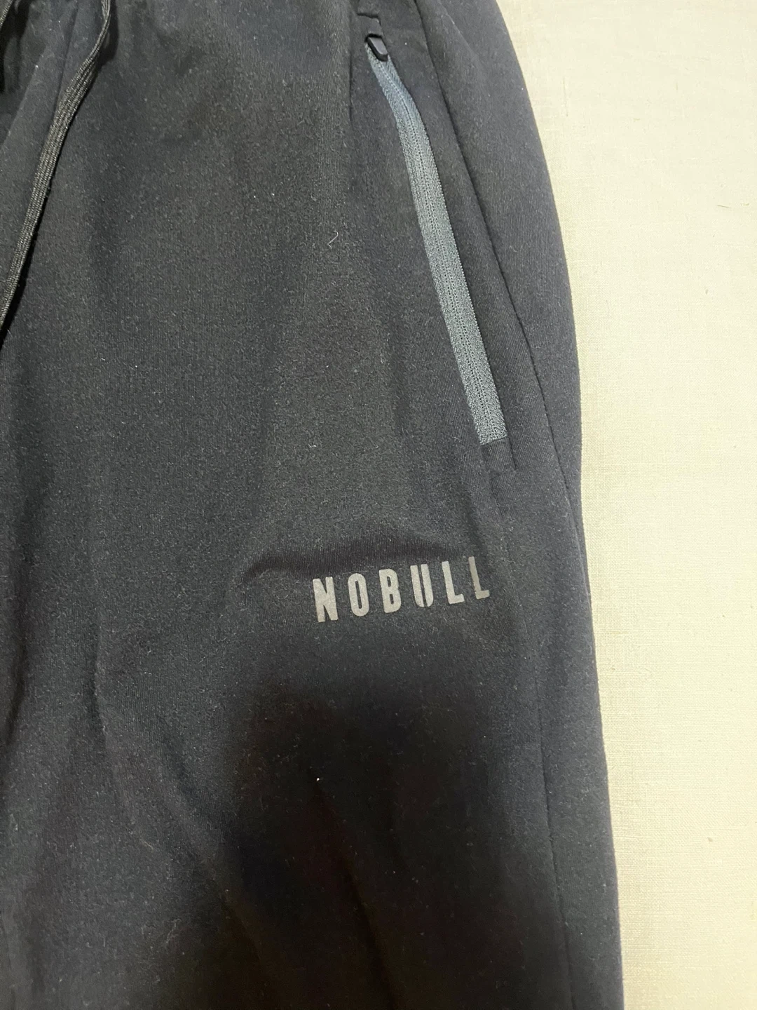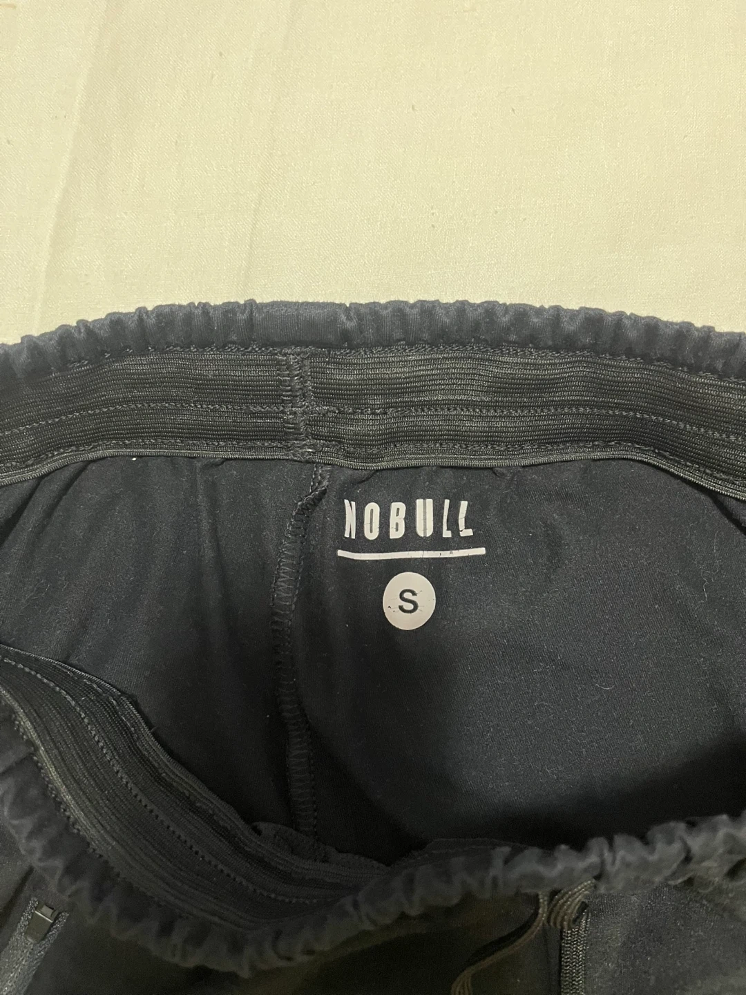 These are black NOBULL jogger pants in size small. They're made of a comfortable fabric with zippered pockets and a drawstring waist. Perfect for workouts or casual wear!