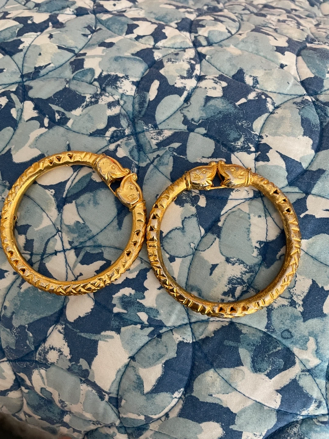 A pair of gold-tone bangle bracelets. Each bracelet features a decorative textured band and a clasp designed as an animal head. These bangles add a unique touch to any outfit.