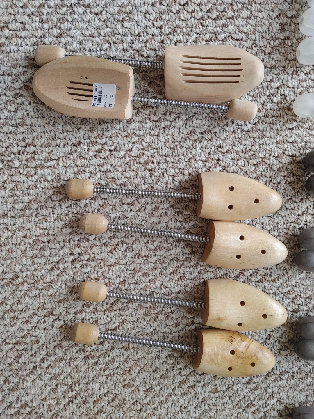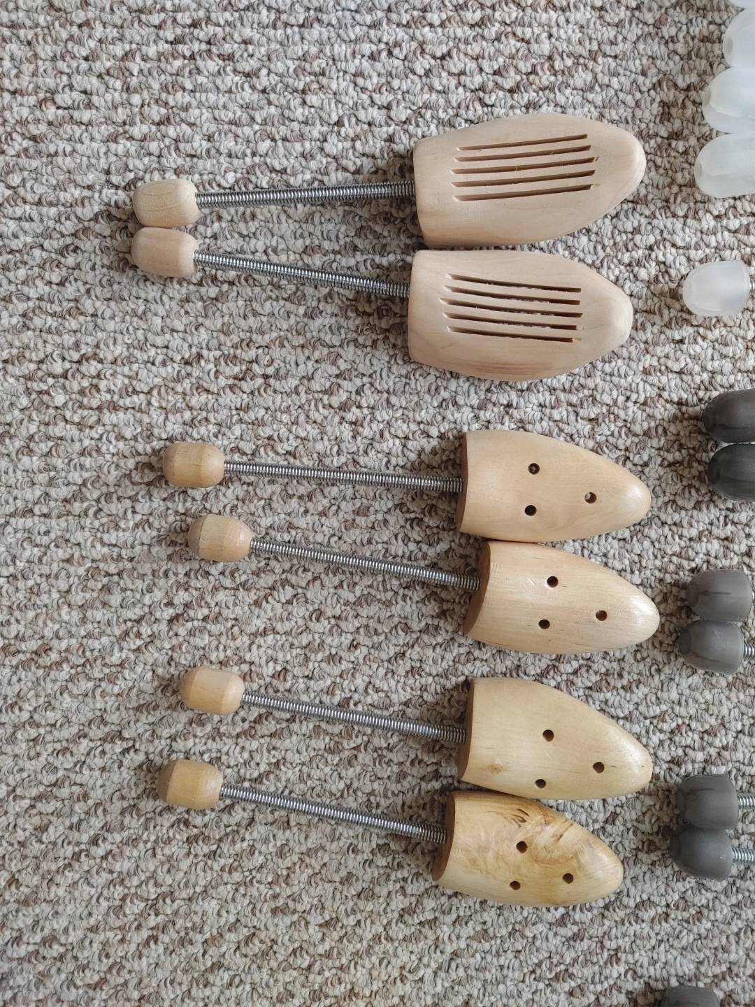 Set of three pairs of wooden shoe stretchers. Adjustable with spring mechanism. Different styles. Good for maintaining shoe shape.