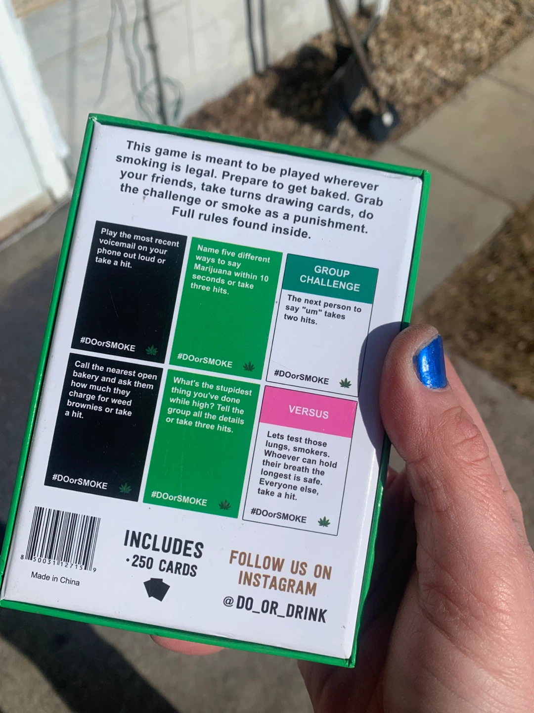 This is the Do or Smoke card game with over 250 cards. It's a game meant to be played wherever smoking is legal. Prepare to get baked, grab your friends, take turns drawing cards, do the challenge or smoke as a punishment.