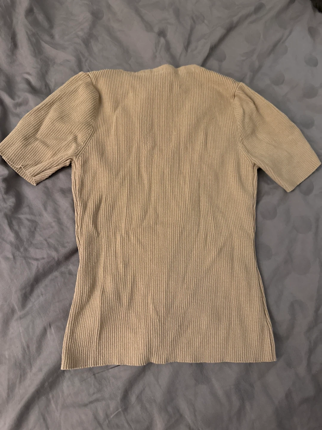 Tan V-neck top with short sleeves. Ribbed knit material. It's a versatile piece for everyday wear.