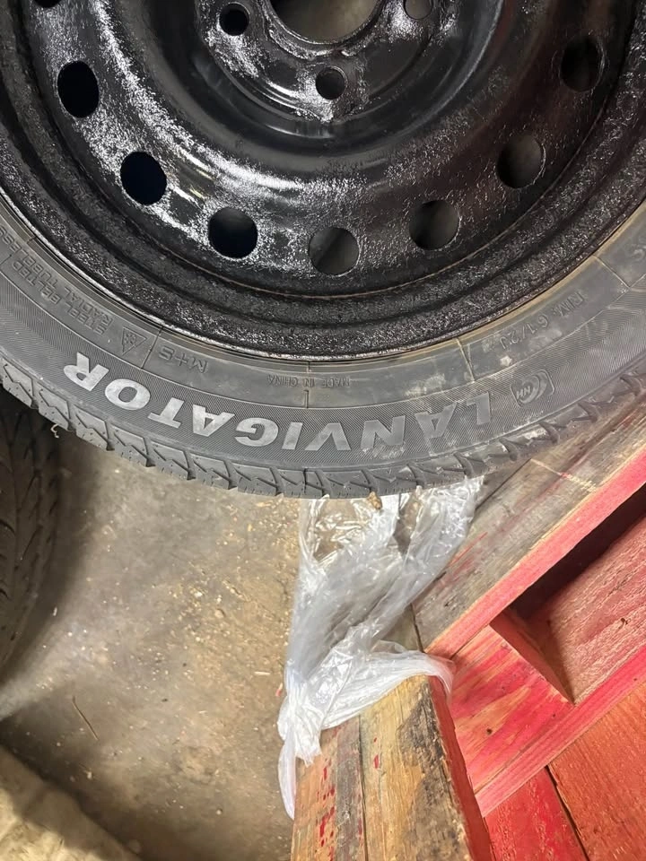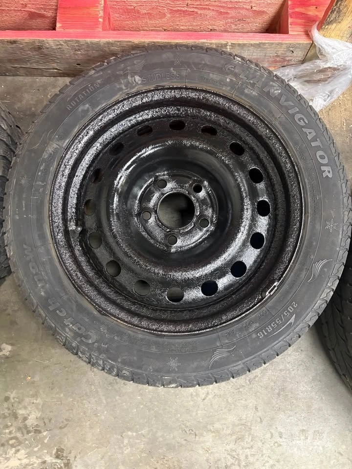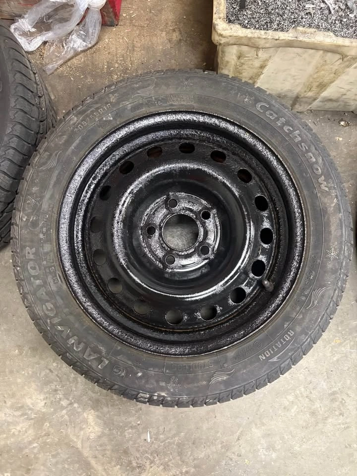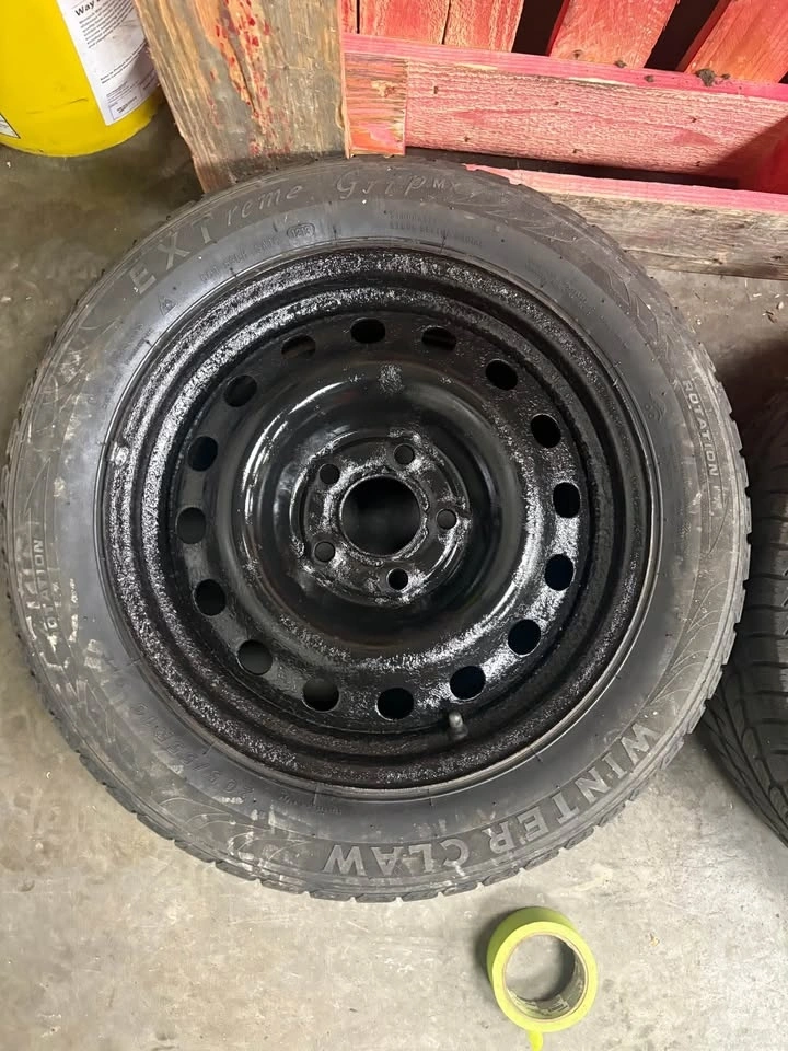 Good used winter tires on steel rims. Around 5–6/32 tread. One tire is a different brand but the same size. Rims have been freshly painted. Ready to bolt on.