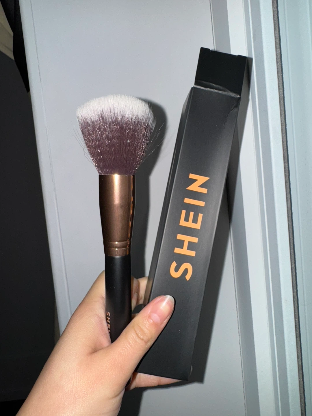 This is a SHEIN makeup brush. It has a dense, fluffy head and a rose gold ferrule. Comes with its original box.