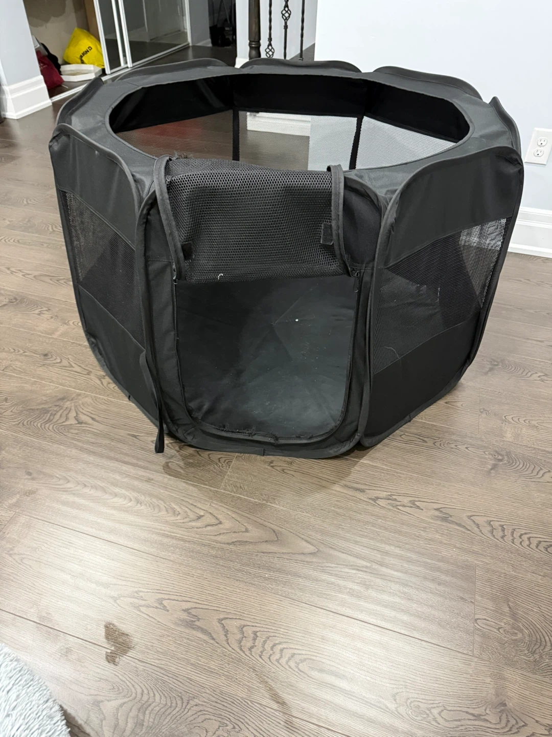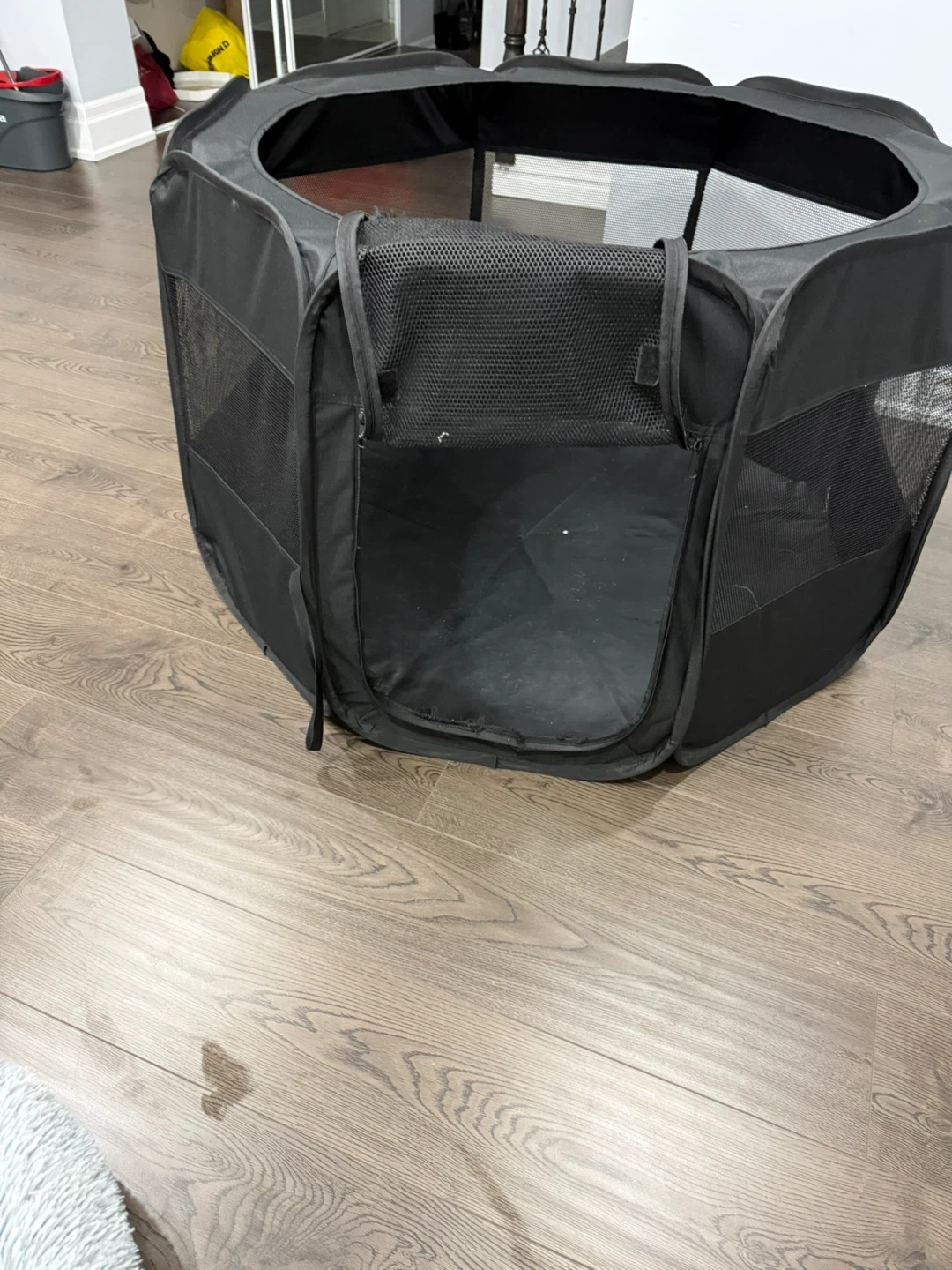 This octagonal pop-up playpen is black and made of durable fabric with mesh sides for ventilation. It features a zippered door for easy access. It's great for keeping small pets safe and contained indoors or outdoors. Easy to fold and store when not in use! Only used for one week.