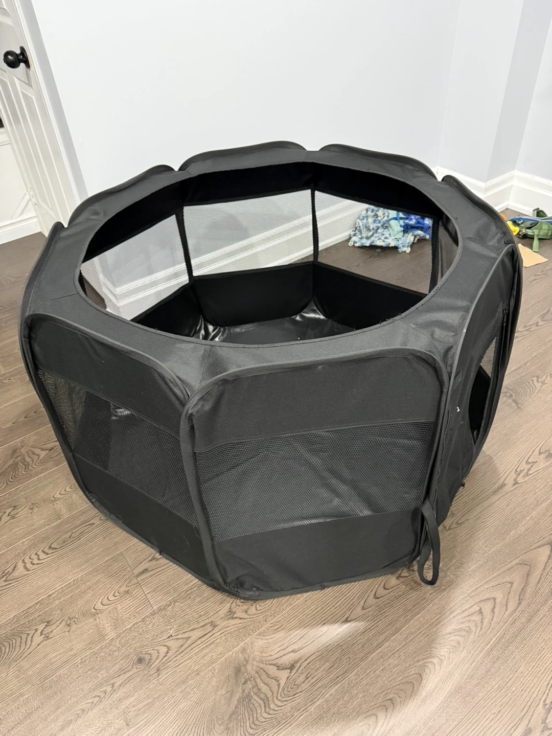 This octagonal pop-up playpen is black and made of durable fabric with mesh sides for ventilation. It features a zippered door for easy access. It's great for keeping small pets safe and contained indoors or outdoors. Easy to fold and store when not in use! Only used for one week.