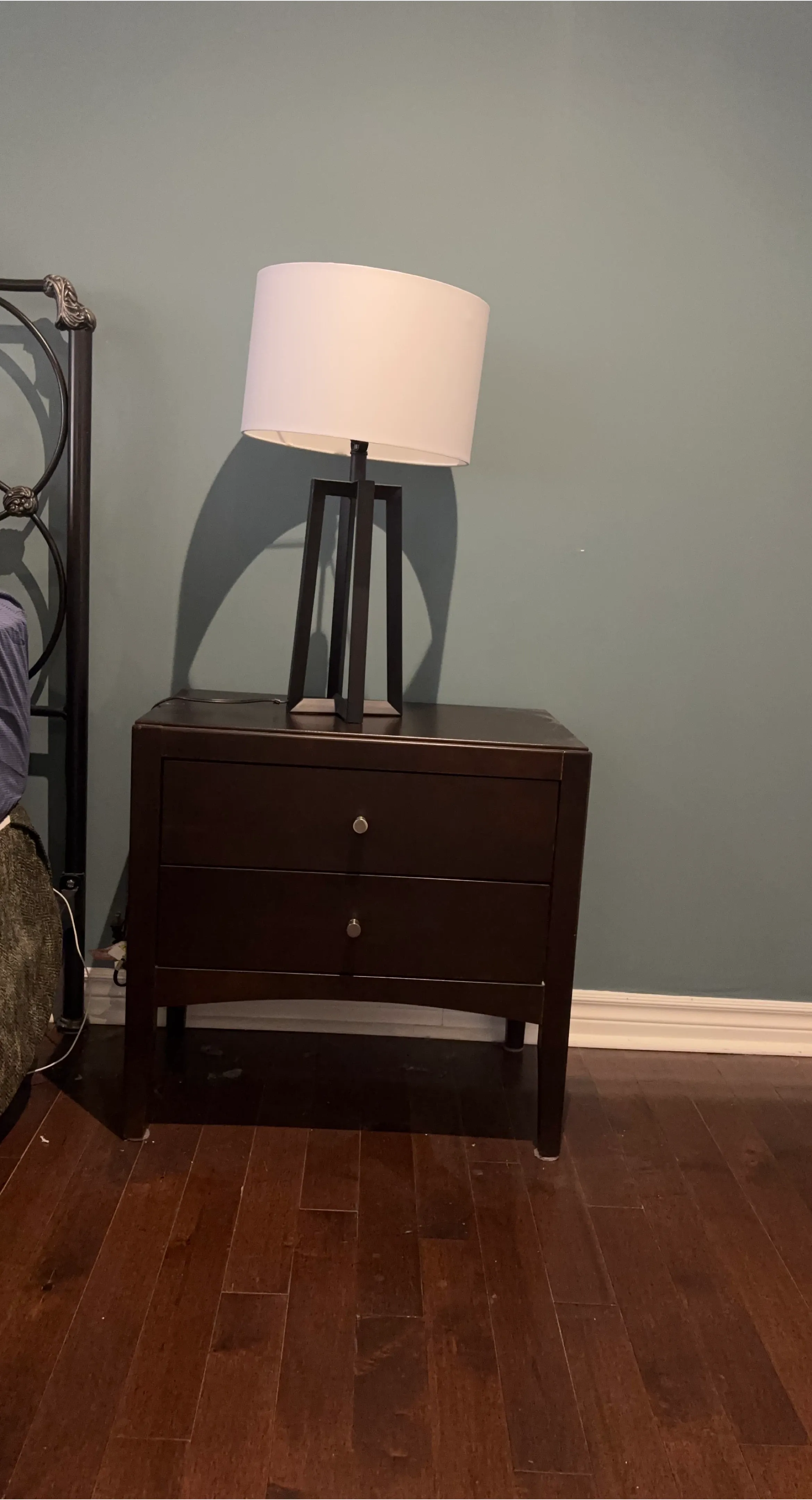 This is a dark wood nightstand with two drawers. It has simple metal knobs. Perfect for storing bedside items. 2 available.