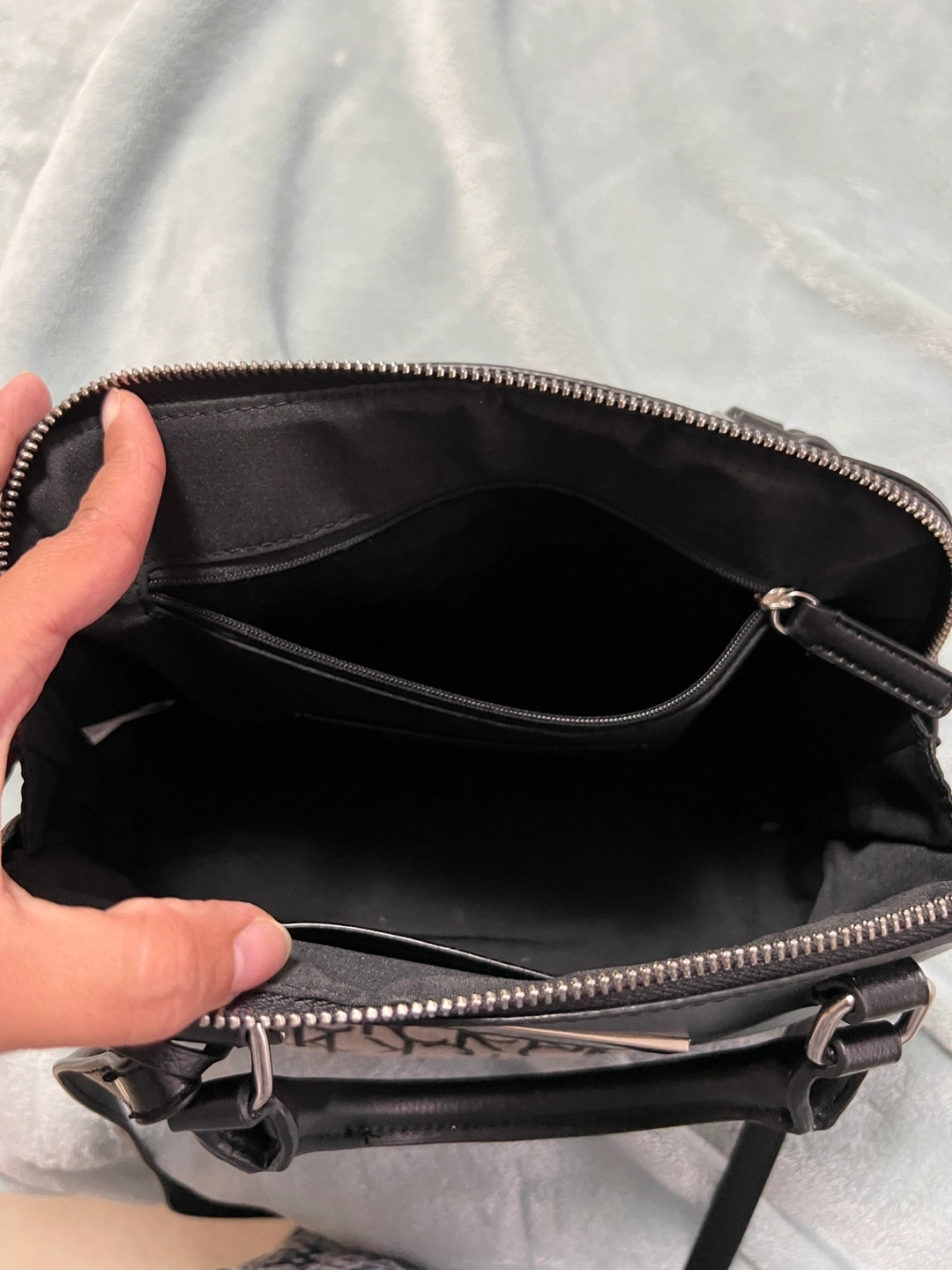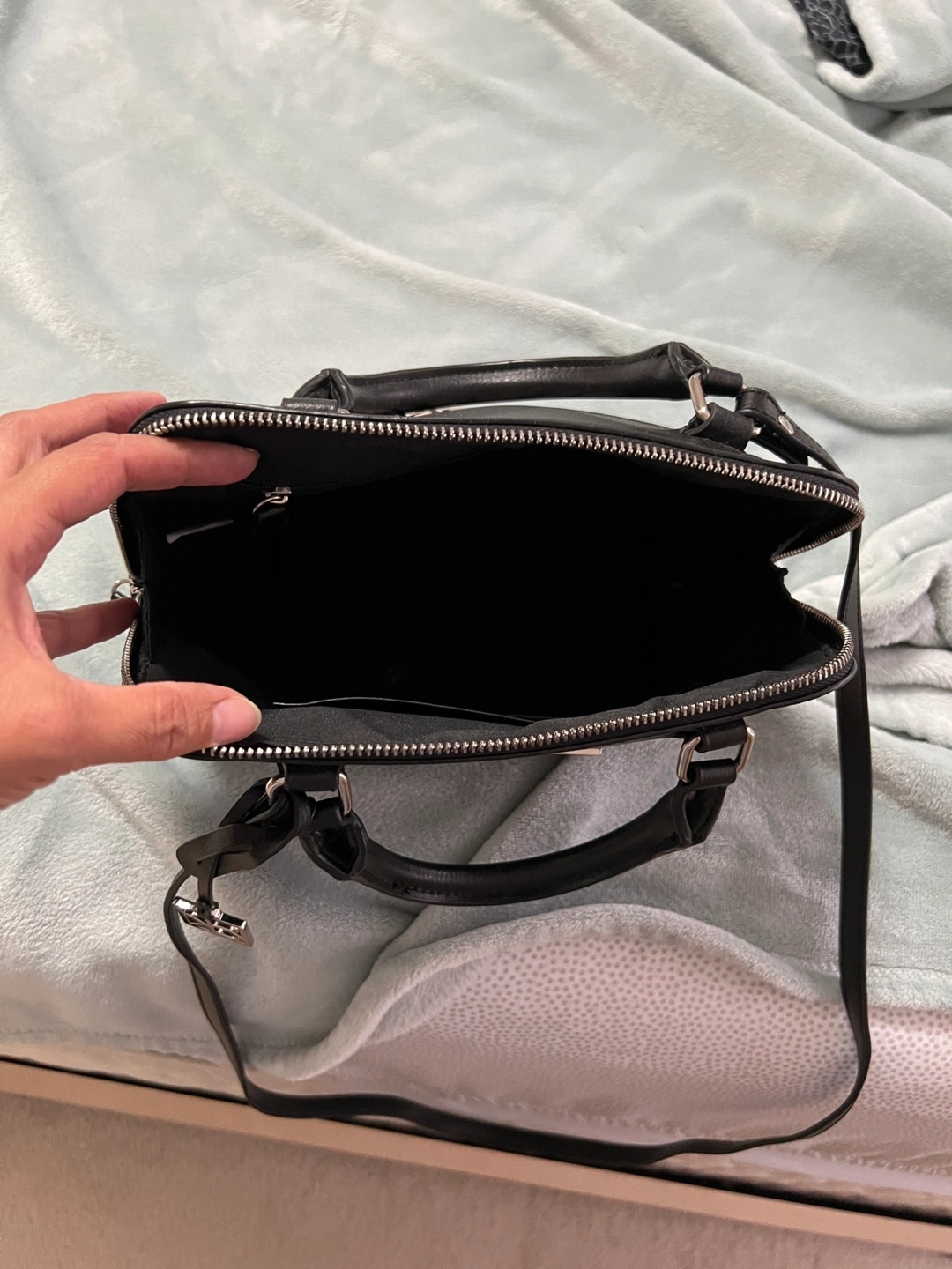 Black and tan satchel with an adjustable strap. Has a zippered pocket on the inside. Comes with a small charm.
